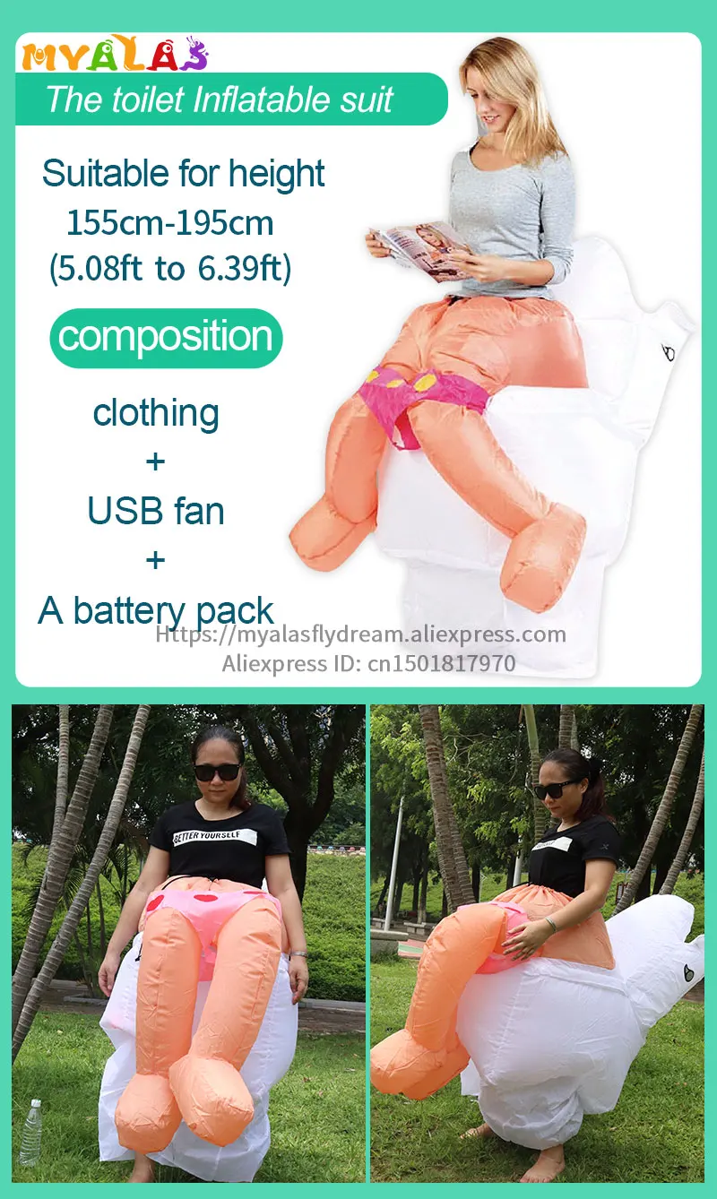 Надувной костюм для унитаза Размер: подходит для высоты от 1,55 м до 1,95 м Посылка включает в себя: ткань, трусы, воздуходувка (не включает батарею) Материал: водонепроницаемый полиэстер Вес: около 0,65 кг Размеры посылка: 30x15x8 см