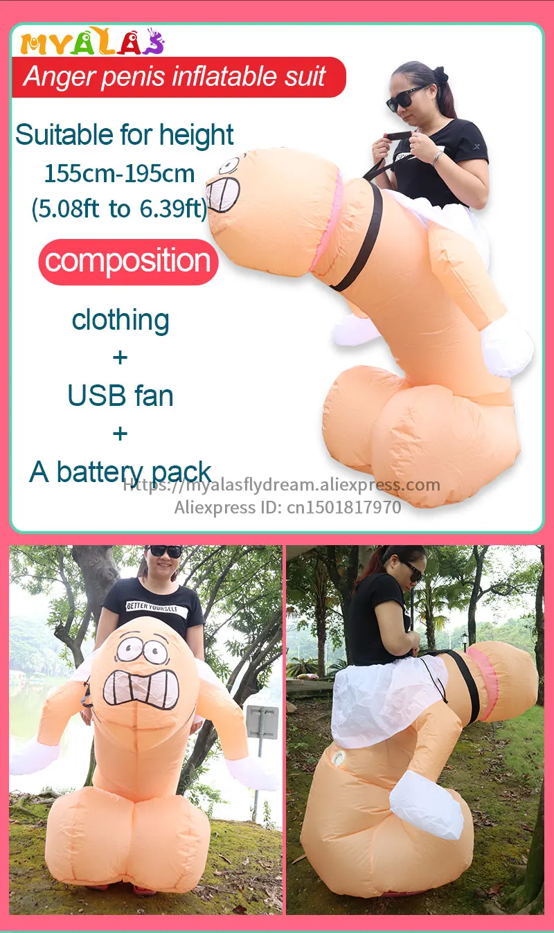 Надувные гнев костюм-пенис Размер: подходит для высоты от 1,55 м до 1,95 м Посылка включает в себя: ткань, воздуходувка (не включает батарею) Материал: водонепроницаемый полиэстер Вес: около 0,65 кг Размеры посылка: 30x15x8 см