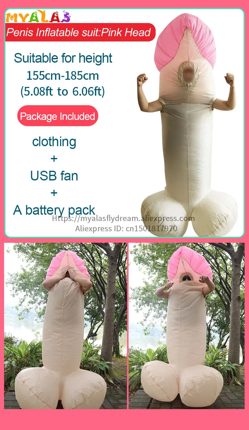 Надувной костюм для пениса: розовая голова и телесный цвет Размер: подходит для высоты от 1,55 м до 1,85 м (от 5,08ft до 6,06ft) Посылка включает в себя: ткань, воздуходувка (не включает батарею) Материал: водонепроницаемый полиэстер Вес: примерно 0,6 кг Размеры посылка: 30x15x8 см