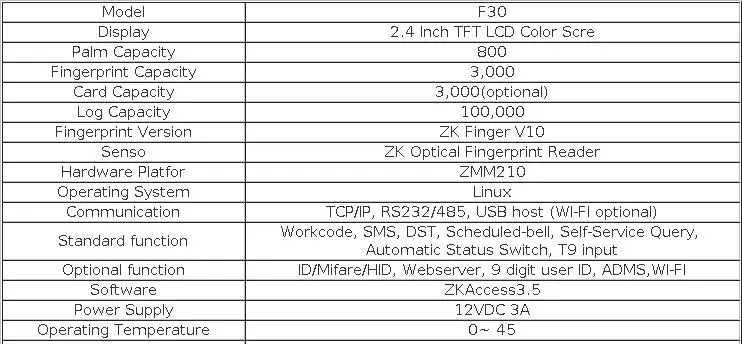 F30 машина контроля доступа-это новая машина контроля доступа, введенная центральным интеллектом. Он принимает BioID fingerprint head, 4*4 сенсорных клавиши и функцию palmprint, что позволяет вам работать быстрее и эффективнее продуктов и услуг. У этой модели есть 2,4-дюймовый TFT цветной экран, общение с TCP / IP, RS485 двумя способами, может быть легко связаны с вашей сети окружающей среды, ее дополнительно adm функция, чтобы помочь вам достичь распределенной широкой сети управления человеческими ресурсами. Метод ввода T9 может легко вводить китайские иероглифы, такие как написание короткого сообщения, изменение имени и быть простым в использовании. С различными простыми функциями контроля доступа, такими как дверной магнит, сигнализация, анти-подводная лодка и т. д., это даст вам гарантию безопасности. В режиме проверки существует несколько методов проверки и комбинированных проверок, чтобы облегчить использование и лучше поддерживать вашу безопасность. Дополнительный IC, ID, HID Карта, такой мощный контроль доступа, позволит вам наслаждаться различным опытом обслуживания.
