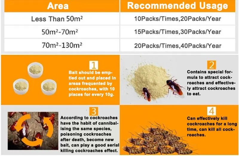Это убийца тараканов, который может быть использован в качестве приманки, нацеленной на тараканов в или возле их бороды. Такие как домашние, коммерческие и общественные здания, фермерские здания, предприятия по переработке пищевых продуктов, фабрики, больницы, дома, кухни, офисы, рестораны, розничные магазины, складские помещения, транспортных средств и других ситуаций, которые подпадают под эти определения.