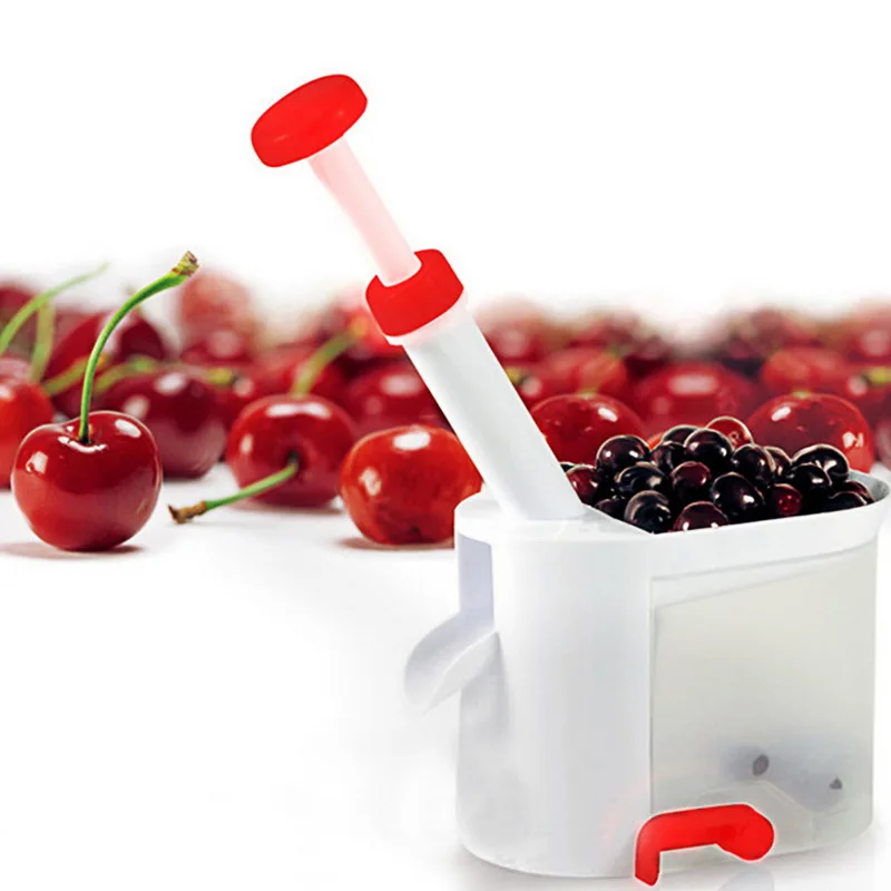 3. ручка сенсорного домкрата с внутренней стороны утюга из нержавеющей стали с внутренней стороны, затем Проколотая Вишневый ядерный шип к чашке внутри тела, затем весь без косточек мягко обратно и подавление, вишни без косточек выкатились из отверстия, которое вы положили в миску.