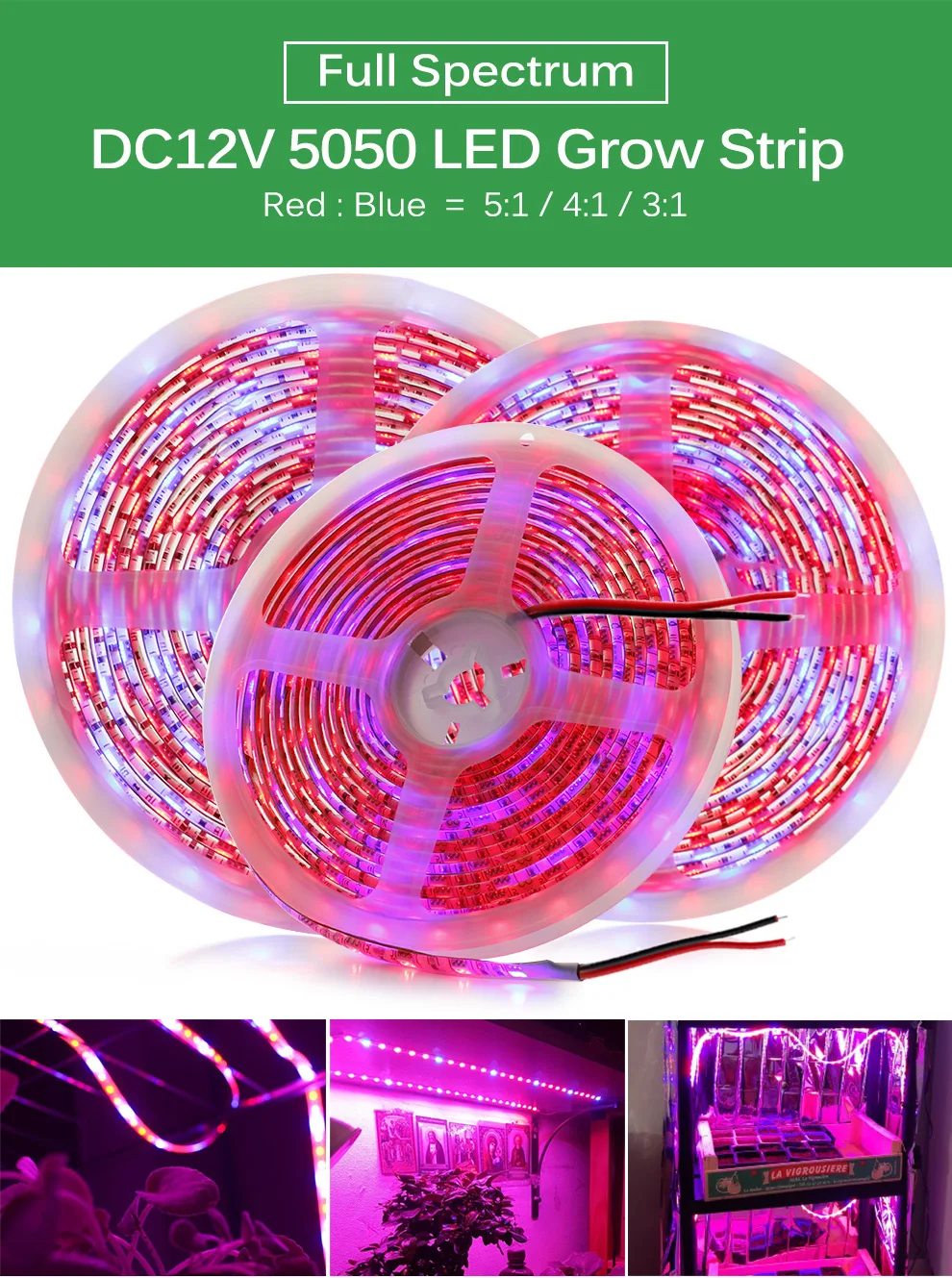 导致植物生长灯全谱Phytolamp对植物花的种子发朵带SMD 5050条温室种植帐篷5米 注意:3.红色的1蓝色=(红色:蓝色= 3:1) 4红色的1蓝色=(红色:蓝色= 4:1) 5红色的1蓝色=(红色:蓝色= 5:1) 规格:1.大小:L500cm W1cm x T0.25cm(5米)2.发光颜色:红+蓝3.保护率:IP20没有防水/IP65防水4.工作电压:12 v直流5.领导的数量:60 led /米,5米/卷6.红色:蓝色= 3:1 /4:1 /5:1 包包括:1卷* 5米长光条(领导不包括任何控制器,连接器和电源)