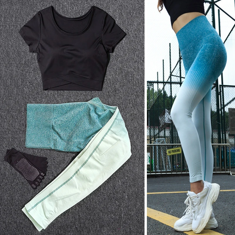 Женский комплект из 2 предметов для йоги, спортивные штаны для фитнеса, уличная футболка для бега, одежда для занятий спортом, спортивная одежда для похудения, костюм, носки для йоги