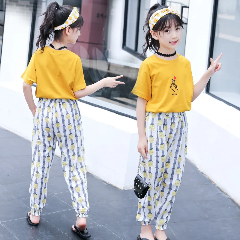 Комплект одежды для девочек; Детский комплект из двух предметов; Детский летний костюм; Футболка; Шифоновые широкие брюки; От 7 до 14 лет