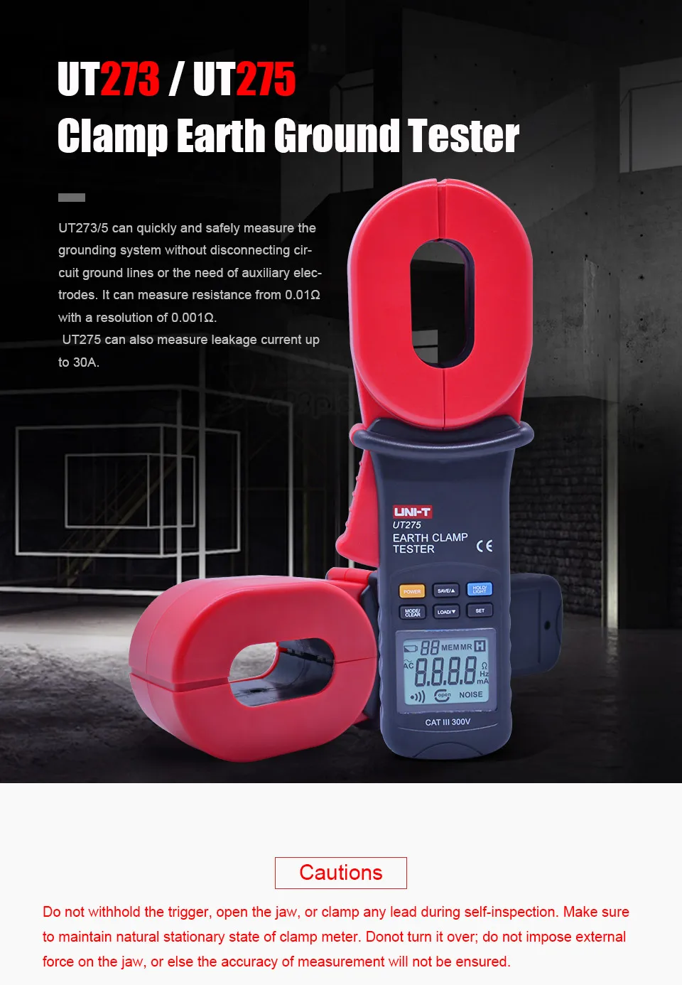 Серия UT270 может быстро и безопасно измерять систему заземления без отключения линий заземления или необходимости дополнительных электродов. Он может измерять сопротивление от 0.01Ω с разрешением 0.001Ω. UT275 также может измерять ток утечки до 30A. Эти clamps'double insulation design делают их прочными инструментами для наружной работы и эффективно блокируют помехи от окружающей среды.