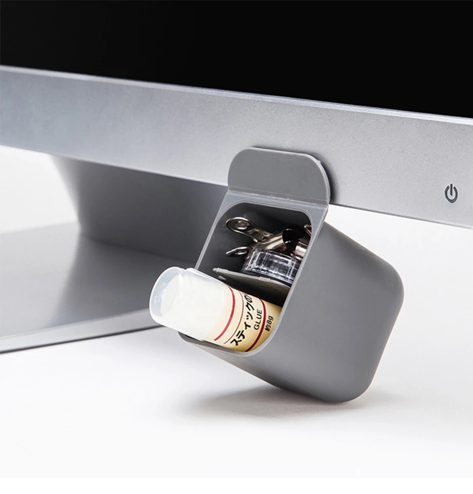 Ящик для хранения может быть закреплен под монитором для хранения канцелярских принадлежностей и небольших предметов.