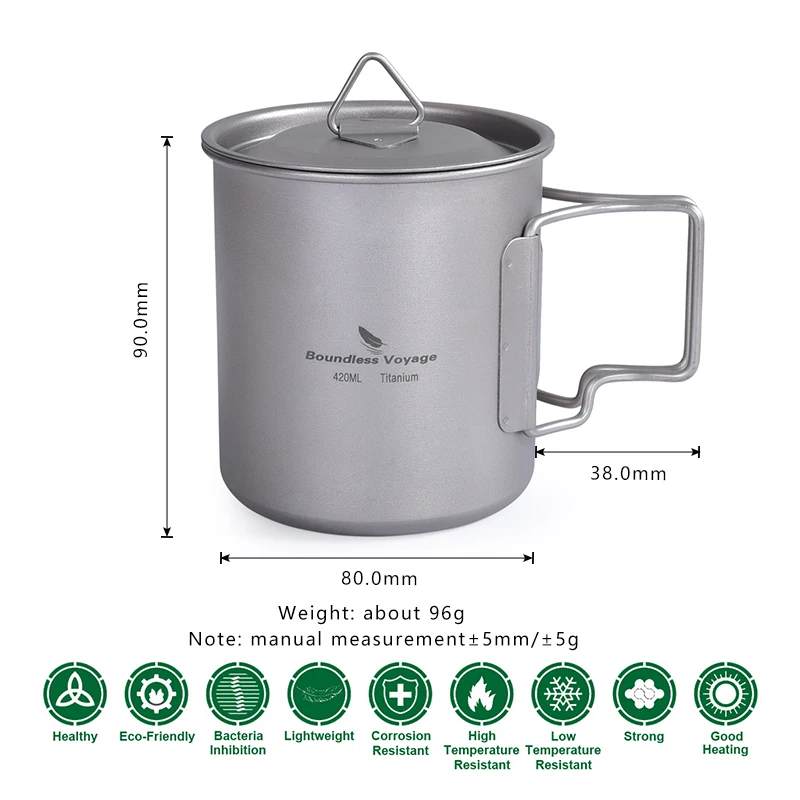 Модель: Ti1544C Материал: 99.8% титана Размер: Диаметр: 80 мм (внутренний), 90 мм (внешнее) Высота: 92 мм Толщина: 0,5 мм Вес: около 93 г Емкость: около 450 мл Место происхождения: Китай (материк)