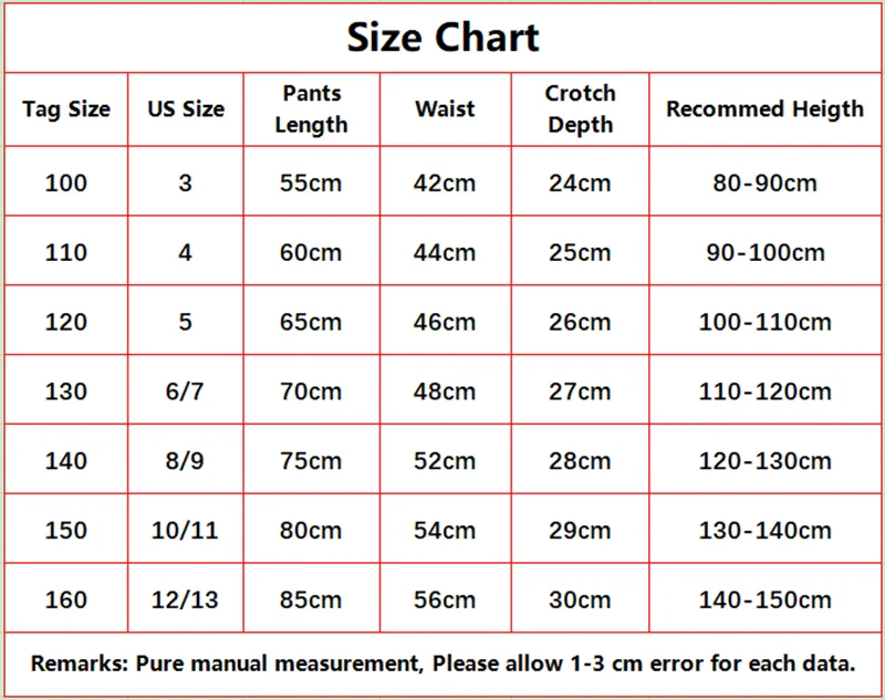 1. Пожалуйста, сверьтесь с таблицей размеров «рекомендуемый рост», чтобы выбрать размер, и сравните длину штанов, которые обычно носит ваш ребенок. Для детей с избыточным весом рекомендуется выбирать на один размер больше;