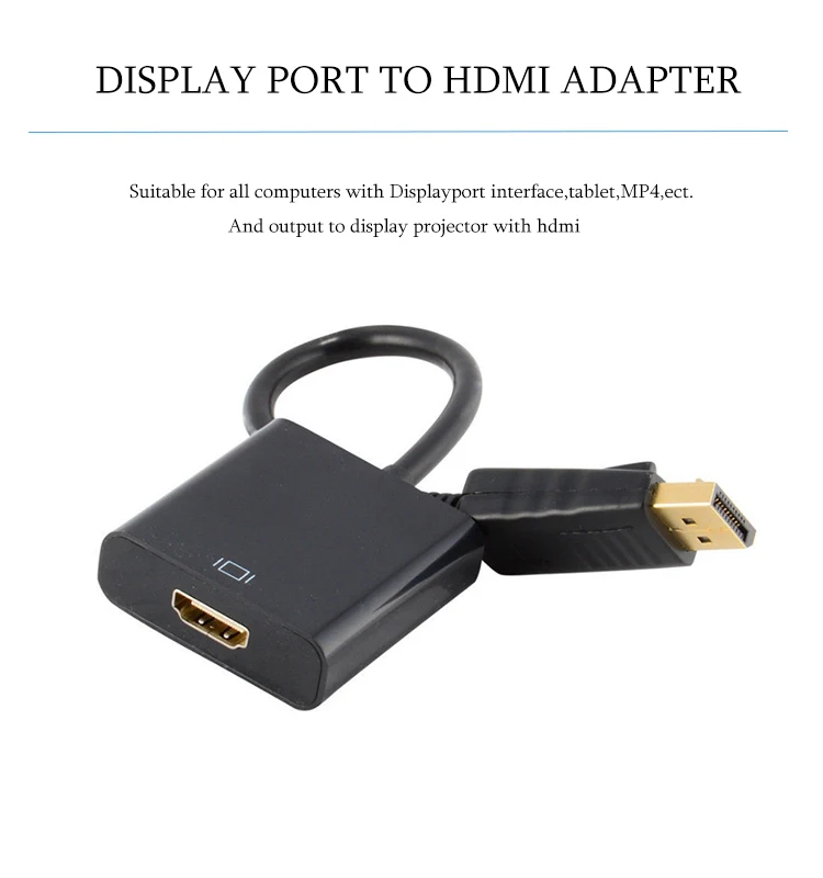 DP к HDMI Особенности: 1. Поддерживает DisplayPort v1.1. 2. Поддержка преобразования сигнала DisplayPort в VGA. 3. Поддерживает 20-контактный интерфейс DisplayPort. 4. Поддерживает пропускную способность видео до 10,8 Гбит/с. 5. Поддерживает разрешение видео до full HD 1080 P. 6. Поддерживает одностороннее, одноканальное, четырехпроводное соединение. 7. Поддерживает горячую замену. 8. Простая эксплуатация, быстрая установка, без настройки. 9. Подходит для всех компьютеров с интерфейсом Displayport, планшета, MP4 и т. д. и вывода для отображения проектора с hdmi.