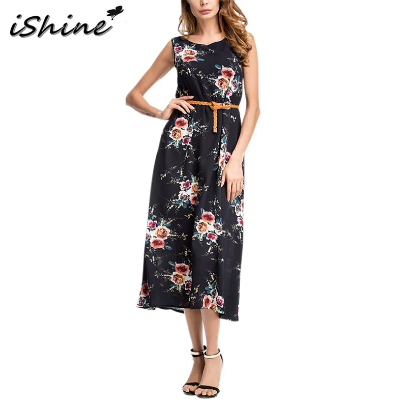 Isine 2017 Лето без рукавов женское шифоновое платье макси повседневные с вырезом цветочный принт длинное Бохо пляжное платье с поясом vestidosДолл. 24,10/Шт