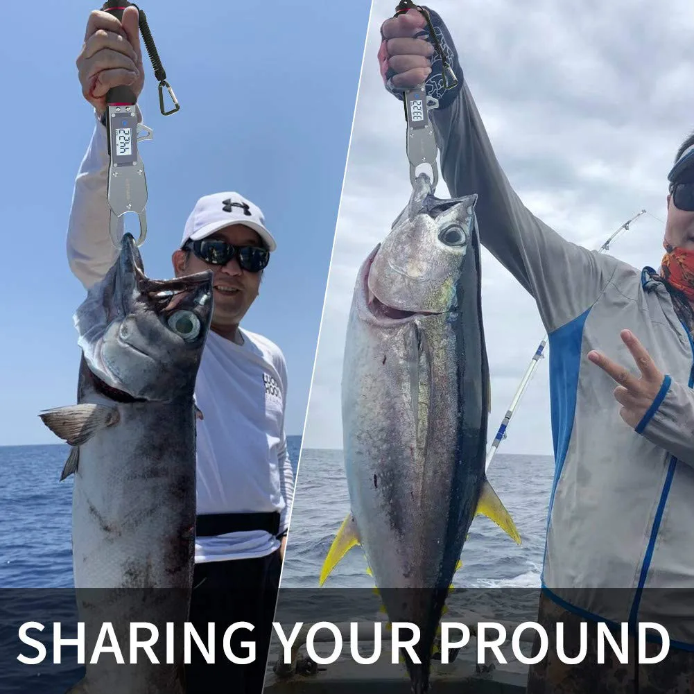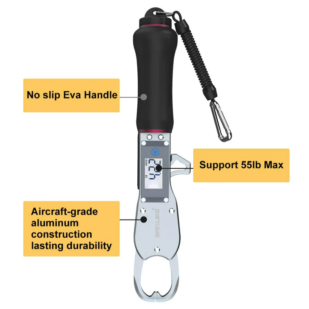 1. Цифровые весы: рыболовная ручка с цифровой шкалой безопасна и удобна, максимальная масса составляет 55 фунтов. Примечание: чтобы убедиться в точности взвешивания, удерживайте захват вертикально при запуске и сбросьте перед взвешиванием.