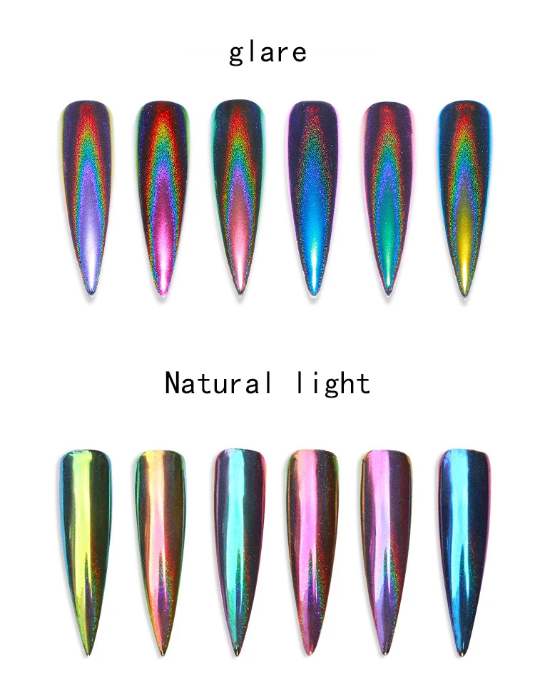 Способ применения: 1. Очистите поверхность ногтей 2. Нанесите Базовое покрытие (черный рекомендуется) 3. Используйте палочку для нанесения теней, чтобы выбрать пудру и нанести ее на ногти 4. Повторите шаг до тех пор, пока вы не будете удовлетворены эффектом. 5. Закройте его верхним слоем UV.