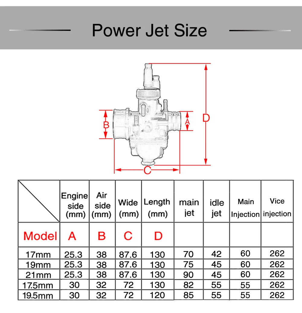 Номер товара | Диаметр | Цвет | Внешний диаметр к воздушному фильтру | Внешний диаметр для впуска | Основная струя |