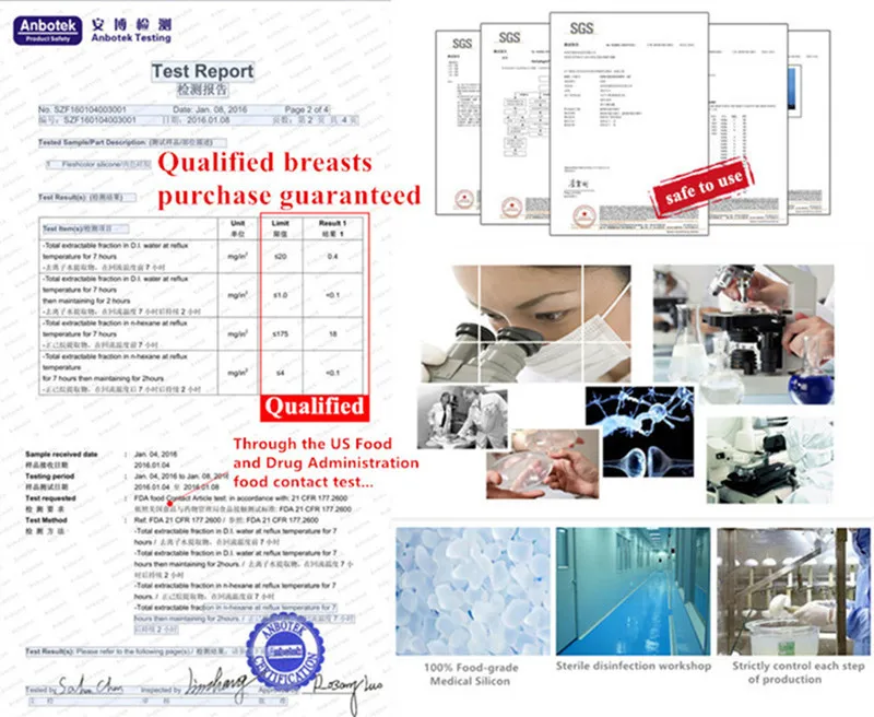 Наши силиконовые формы груди продукты проходят строгий контроль качества, и он прошел сертификацию качества SGS. Он соответствует стандартам Управления по контролю пищевых продуктов и лекарственных средств США для тестирования контакта с пищевыми продуктами. Наши силиконовые формы груди продукты изготовлены из 100% пищевого медицинского силикона, который является самой кожей с человеческой кожей. Подобные вещества, нетоксичные и безвкусные, не раздражают кожу и не оказывают никакого влияния на ваше здоровье.