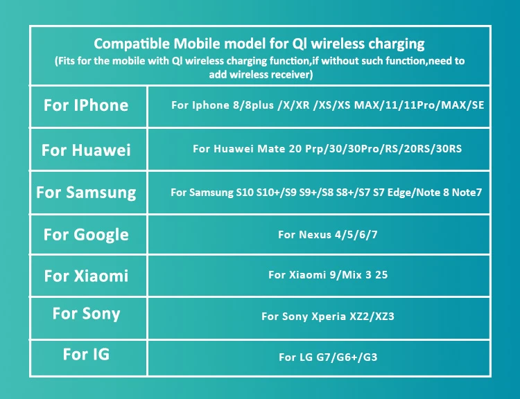 Подходит для мобильного телефона с функцией беспроводной зарядки QI, если без такой функции, необходимо добавить беспроводной приемник