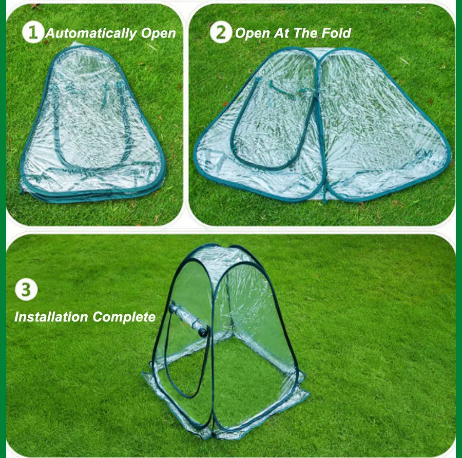 -UV50 + ПВХ покрытие, сережки из нержавеющей стали. Эта портативная всплывающая теплица изготовлена из прочного пластиковый прозрачный ПВХ; 4 угла со стальным заземлением для надежного крепления рамы и крышки.
