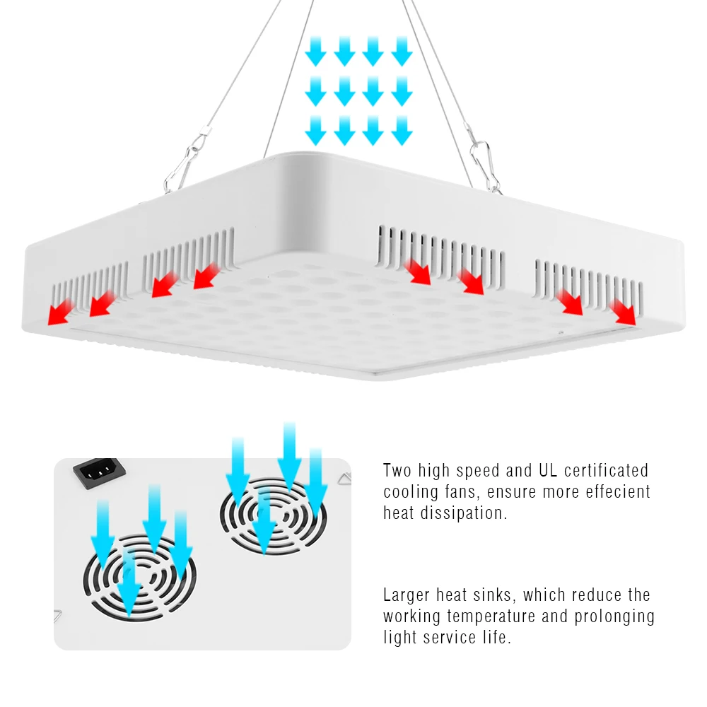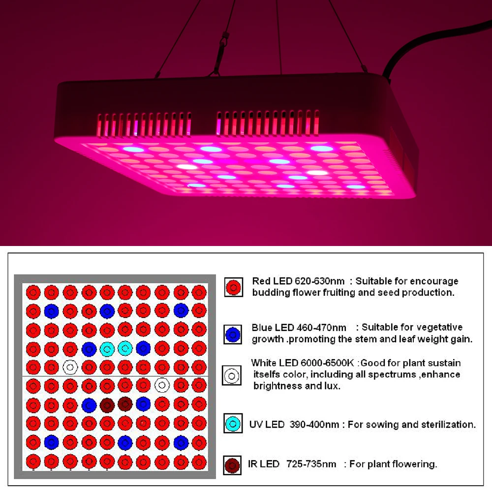 Тип товара: 300 Вт Светодиодный светильник для выращивания Материал: АБС + ПММА крышка Источник питания: AC85V ~ 265V 50Hz-60Hz Разъем питания: ЕС/США/Великобритания/Австралия Светильник источник: 100 светодиодный бусины SMD3030 1-3 Вт Красный 620-630nm 84 шт SMD3030 1-3W синий 460-470nm 10 шт SMD3030 1-3W белый 6000-6500K 2 шт SMD2835 1-3W UV 390-400nm 2 шт SMD2835 1-3 Вт IR 725-735nm 2 шт Мощность: 300 Вт Яркость: 5850 люменов Коэффициент яркости: 8:1 ~ 9:1 Уровень защиты: IP65 Переключатель: ВКЛ./ВЫКЛ. Светодиодный срок службы: 50000 h Сертификация: RoHS CE FCC UL