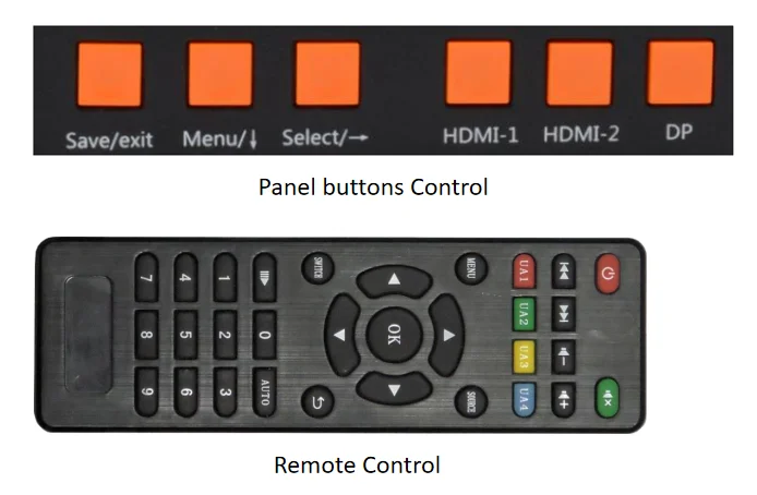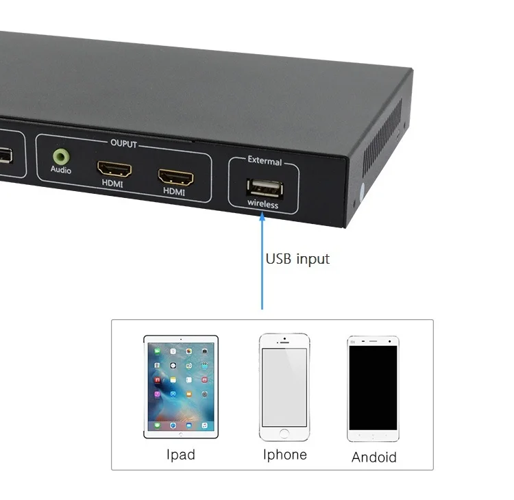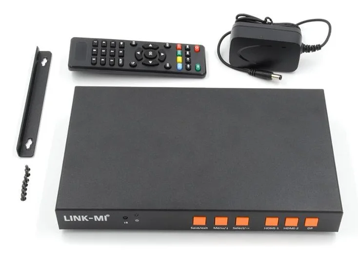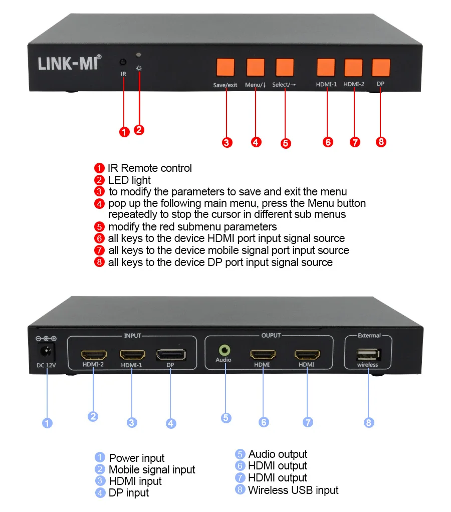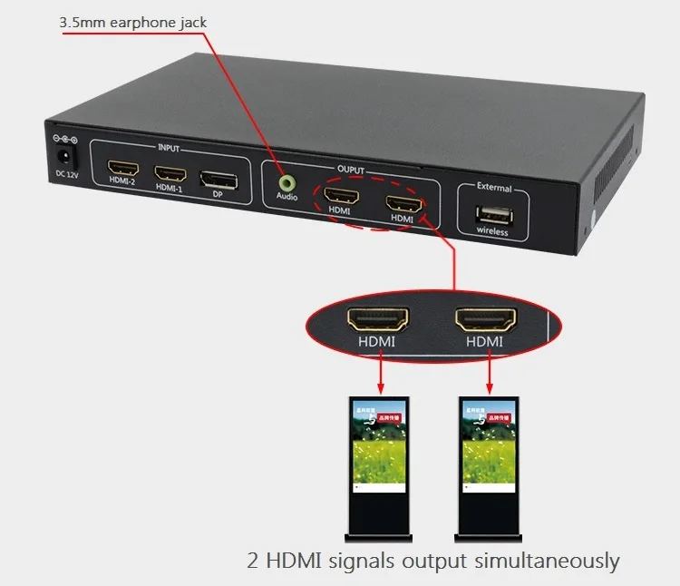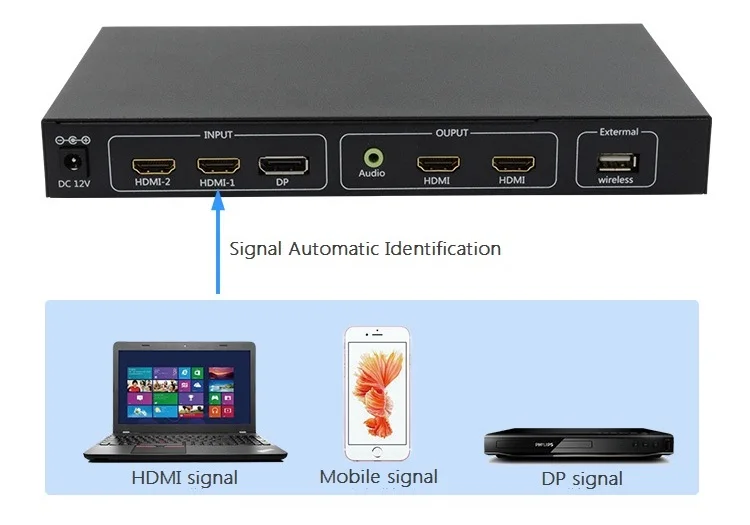 Поставляется с 4 входами: 1 HDMI, 1 HDMI (совместим с мобильным сигналом), 1 DP, 1 USB; 2 выхода HDMI. Пользователь может переключить любой из 4 сигналов на 1 или 2 дисплеев. Он использует высокоскоростной чип обработки изображений. И поддерживает максимальное разрешение до 3840x2160 @ 60 Гц, можно легко управлять с помощью кнопок панели или пульта ДУ.