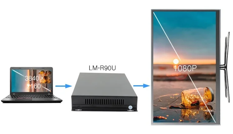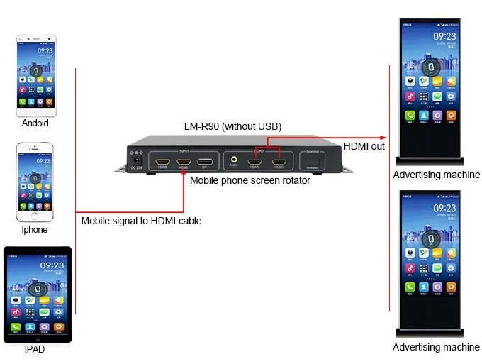 LINK-MI LM-R90U мобильный телефон синхронизация экрана ротатор устройство является высокая производительность изображения ротатор, чтобы включить мобильный сигнал на полный экран дисплей на вертикальном ЖК-экране синхронно. Его основная функция заключается в вращении 90 градусов входного мобильного сигнала, а затем сделать черный край резки, так что видео или мобильный телефон приложение может быть синхронно отображено на вертикальном ЖК-экране. И поддерживает 2 выхода HDMI для синхронизации одного и того же сигнала.