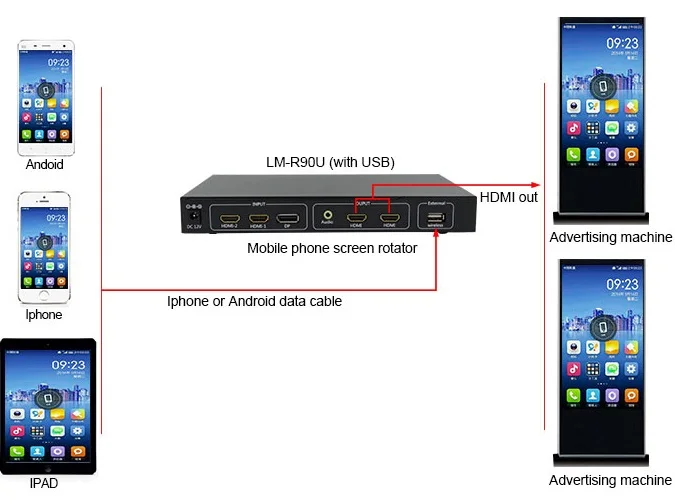 С USB входом, Мобильный сигнал может быть непосредственно подключен к устройству через обычный телефонный кабель для передачи данных. Он может сделатьМобильный телефон изображение/видео/приложение для поворота на 90 градусов для отображения на вертикальный ЖК-телевизор или рекламная машина