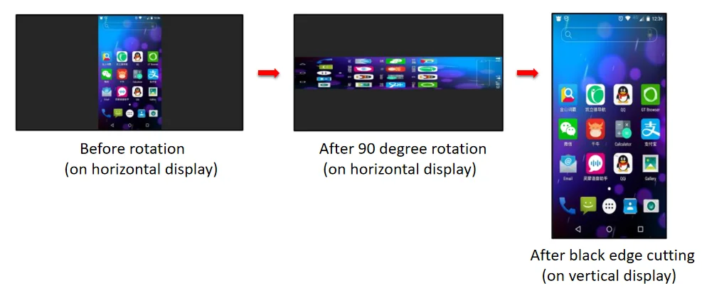 Достичь мобильный телефон дисплей синхронизации сигнала на вертикальном экране через 90 градусов вращения и черный край резки