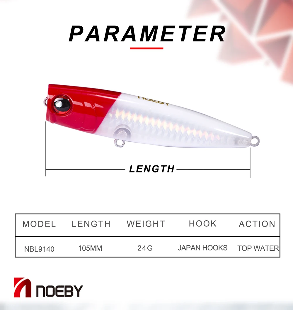 NOEBY Поппер, приманка для рыбной ловли, 105 мм, 24 г, верхняя водная наживка, приманка, искусственные приманки, кренкбейты воблер на щуку, приманка для рыбы Спецификация: 1. Длина: 105 мм 2. Вес: 24 г 3. Глаза: 3D глаза 4. Крючок: острые тройные Крючки 5. Действие: верхняя вода плавающая 6 посылка: блистерная коробка со вставной картой. Особенность: 1. Сильный корпус, яркое плавающее действие, вертикальный голографический эффект рыбьей чешуи может отражать внешсветильник со всех сторон, благодаря сильному соблазну. 2. Острые и прочные тройные Крючки France VMC (или BKK). Информация об упаковке: Блистерная коробка со вставной картой. 1 шт./коробка из ПЭТ