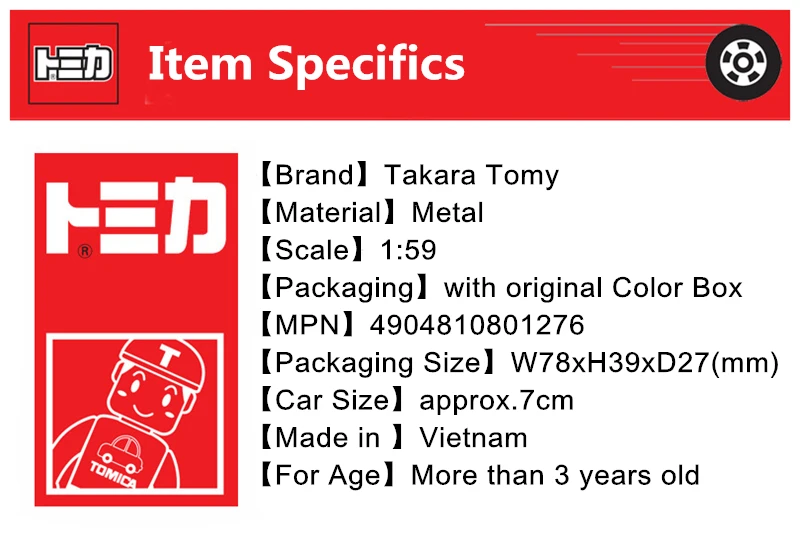 Номер товара. : 4904810801276 Производитель: TAKARATOMY Бренд: Tomica Размер посылка: W78 x H39 x D27 мм Целевой возраст: 3 года ~