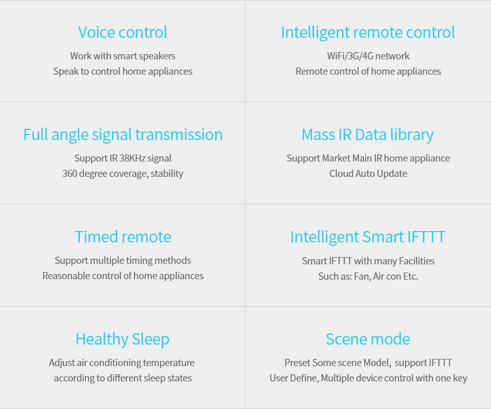 ● Простая в использовании: 1. Загрузите «Tuya» из своего магазина приложений для смартфонов, а затем зарегистрируйте пользователя, если вы уже являетесь пользователем «Tuya», войдите в него. 2. Подключите Rm mini к источнику питания, нажмите кнопку сброса более 5 секунд, пока синий индикатор не начнет мигать. 3. Убедитесь, что смартфон соединиться с 2,4 ггц wi-fi. Держите Rm mini достаточно близко к приборам. 4. Откройте приложение «Tuya» и clcik «добавить все устройства» и выберите «инфракрасный умный пульт дистанционного управления», введите пароль wifi для установки suceed. Затем вы можете выбрать, какие устройства для управления, включая телевизор, AC, вентилятор и т. Д.