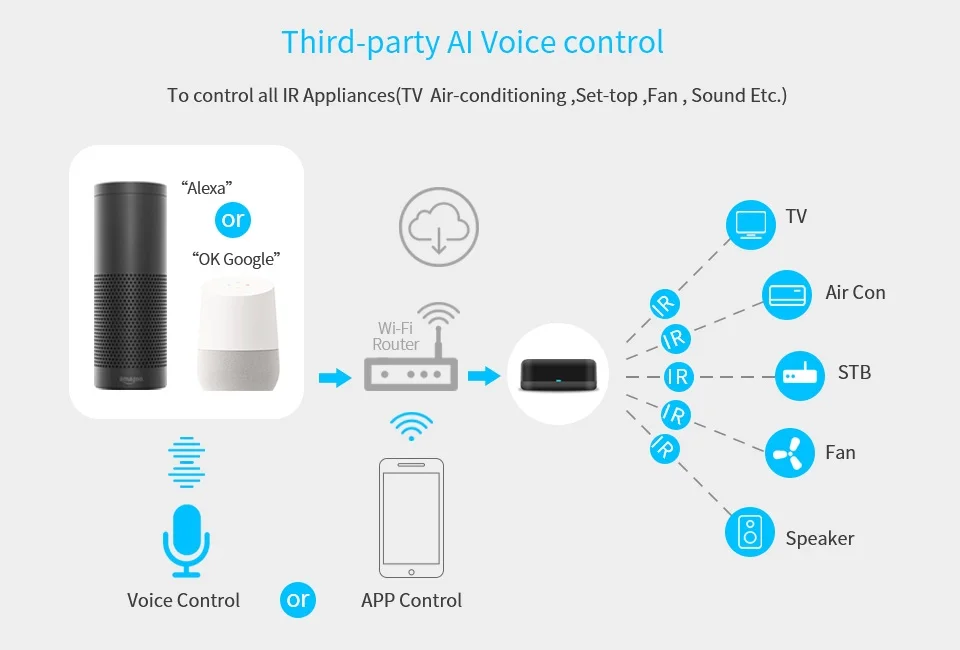 Tuya RM Mini-универсальный пульт для управления инфракрасными приборами через ваш смартфон из любой точки мира. 【Voice Голосовое управление Совместим с Alexa и Google Home для голосового управления вашим телевизором, кондиционером. 【APP управление】 Управление IR прибор с TuyaSmart приложение в любом месте, в любое время (пожалуйста, используйте 2,4 ГГц Wi-Fi). Настройка таймеров для включения/выключения приборов в определенное время или Настройка сцен с помощью нескольких устройств. Превратите базовые домашние устройства в умные устройства и Сделайте жизнь умнее и удобнее. 【Compatibility】 Большая ИК-база данных, более 98% ИК-функции дистанционного управления. Поддерживает устройства с ИК-управлением 80000 +, включая телевизор, DVD, аудио, кондиционер, спутник, PVR и другие функции, если определенные облачные данные недоступны. 【Scheduled feature】 Включайте и планируйте функции на ежедневной основе и настраивайте для ваших потребностей.