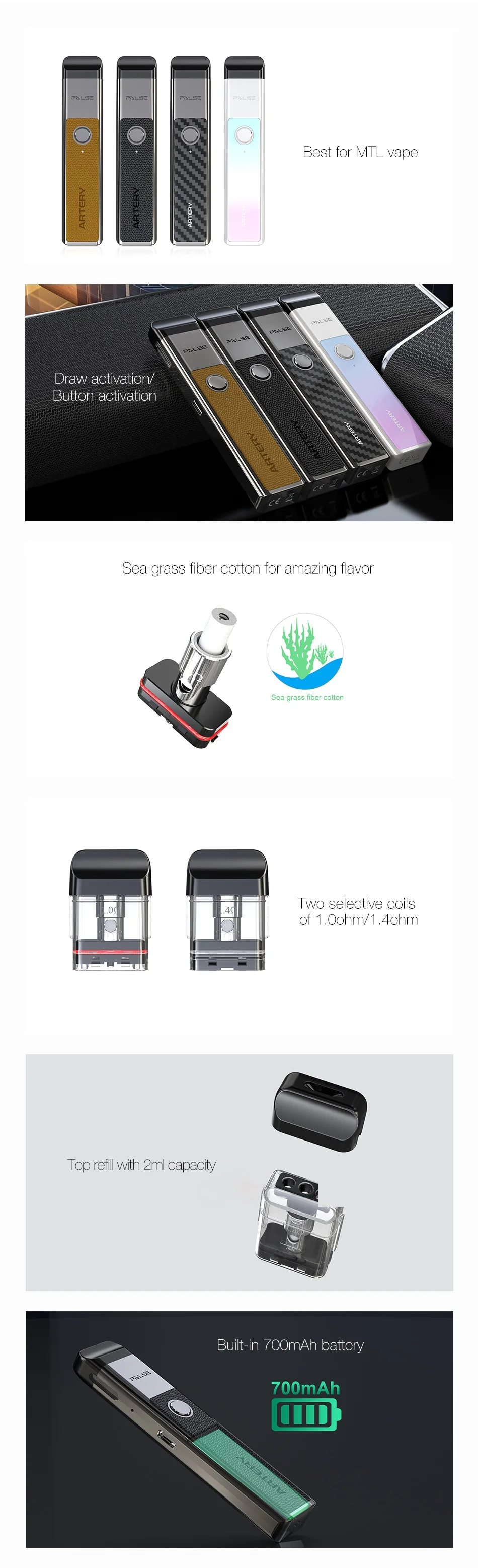 Pod-набор артериального PAL SE-это тонкое устройство для вейпа со встроенной батареей 700 мАч. В артериальном комплекте PAL SE Pod используется новая технология хлопкового волокна sea grass, принося пользователям удивительный вкус вейпа. Артерия PAL SE поставляется с картриджем 2 мл с внутренней катушкой 1,0 Ом и 1,4 Ом, идеально подходит для вейпа MTL. Комплект артериального PAL SE имеет два способа включения вейпа, активацию воздуха и активацию кнопки fire. Удобно для пользователей выбрать предпочтительный способ курения. Верхняя система заправки сока облегчает наполнение.