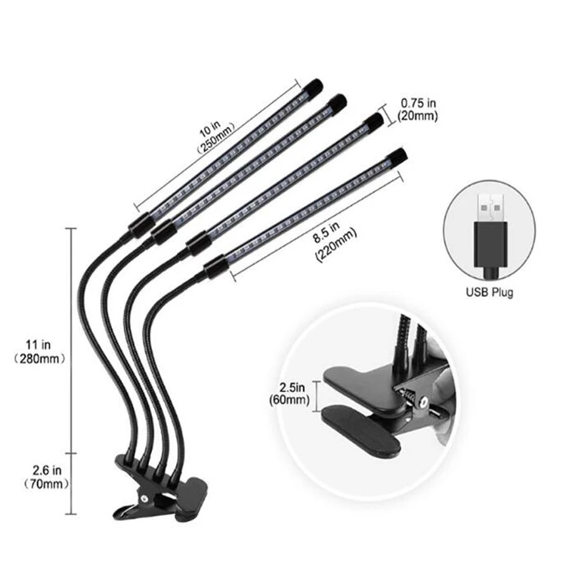 Теплые советы: usb светильник для выращивания не включает usb-разъем 5 В Срок службы: 50000 часов Светодиодный чип: 40 светодиодный s с двумя головками. 60 светодиодный s с тремя головками 3 режима таймера-3 часа, 6 часов и 12 часов. 5 режимов яркости с регулируемой яркостью Изготовлен из алюминия и ПВХ, легкий и прочный с хорошей теплоотдачей. Низкое потребление и экологичность. 360deg гибкие goosenecks позволяют регулировать любое направление или область освещения. Рабочее широкое напряжение: 5 В постоянного тока USB Частота: 50/60 Гц Сертификаты: CE, ROHS, FCC