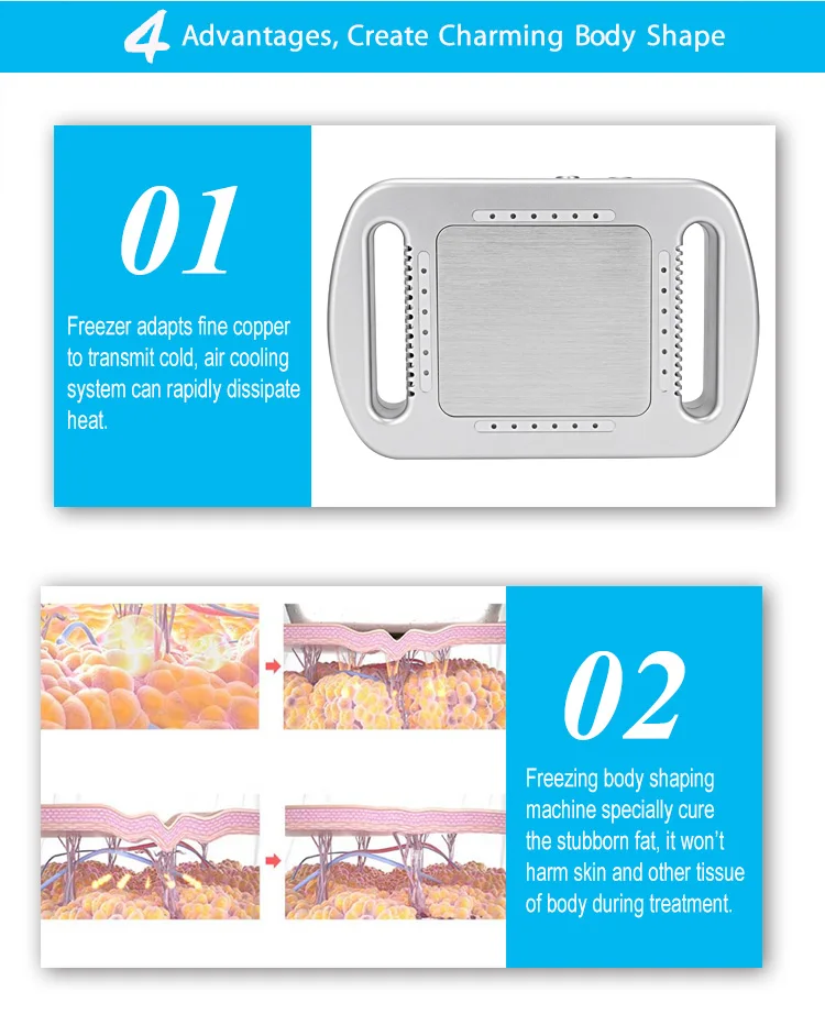 1. Машина для похудения с замораживанием жира принимает тонкую медь для проведения холодной, системы воздушного охлаждения для проведения теплоотвода.