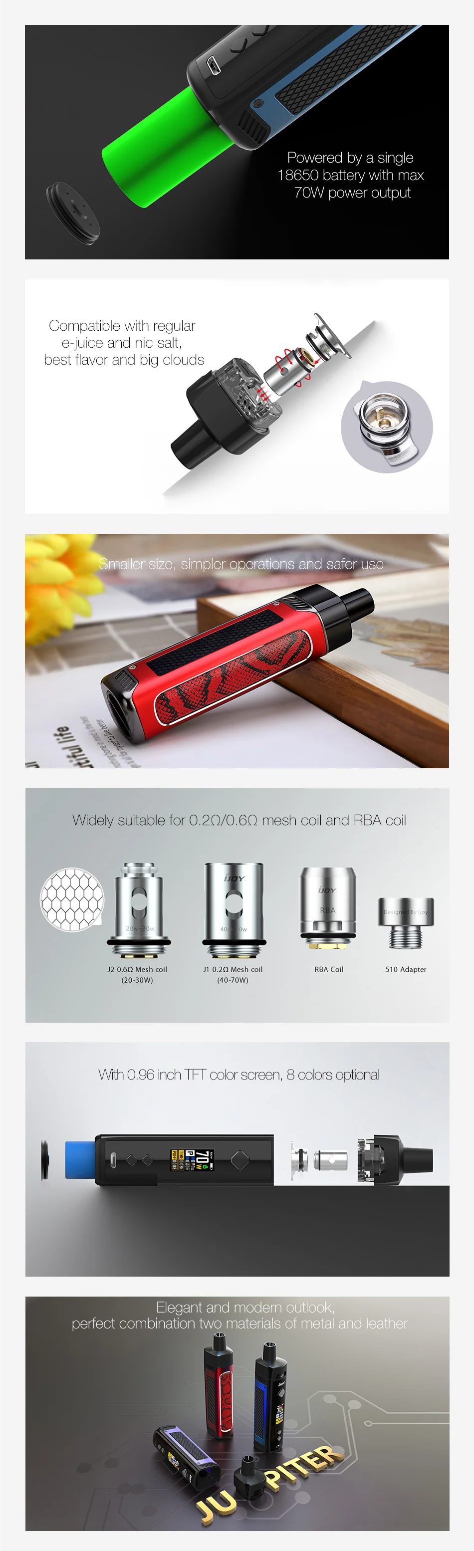 Принят передовой набор микросхем UNIV,Стартовый набор IJOY Jupiter PodИзготовлен из двух материалов металла и кожи с элегантным и современным внешним видом. Питание от одного аккумулятора 18650 с максимальной мощностью 70 Вт, модуль Jupiter поддерживает однодневный паровой режим. В то время как картридж Jupiter Pod имеет емкость 5 мл и нижнюю заправку. И поставляется с сетчатой катушкой J1 0.2ohm и сетчатой катушкой J2 0.6ohm для массивных облаков и оптимального вкуса. Плюс 0,96 дюймовый TFT цветной экран и 8 цветов версия, Just JOY Jupiter Принесет вам большой вейп!