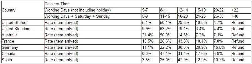 - Срок доставки зависит от места назначения и других факторов. 90% упаковок прибудет в течение 9-25 дней. Иногда это занимает до 45 дней (Россия 60 дней).