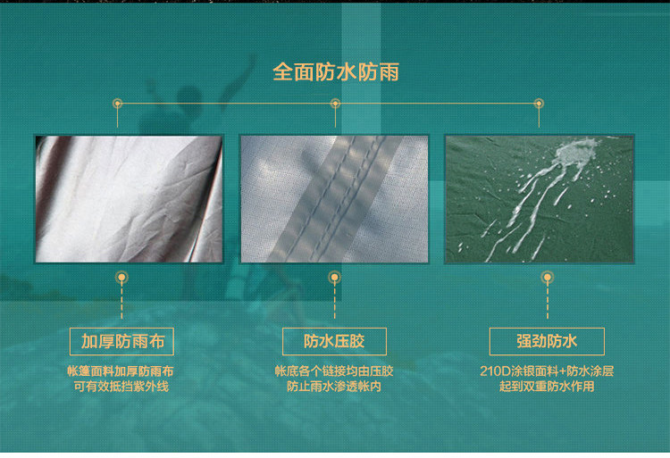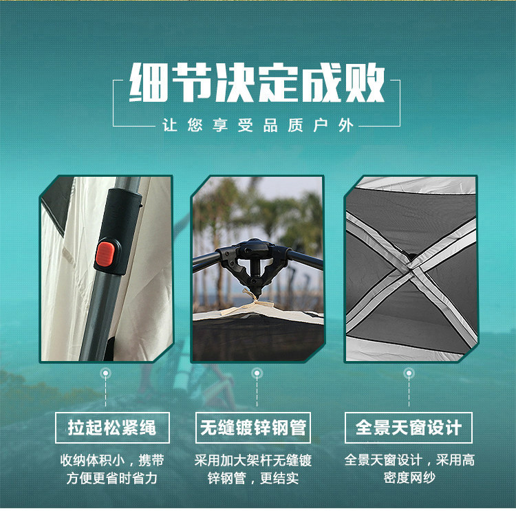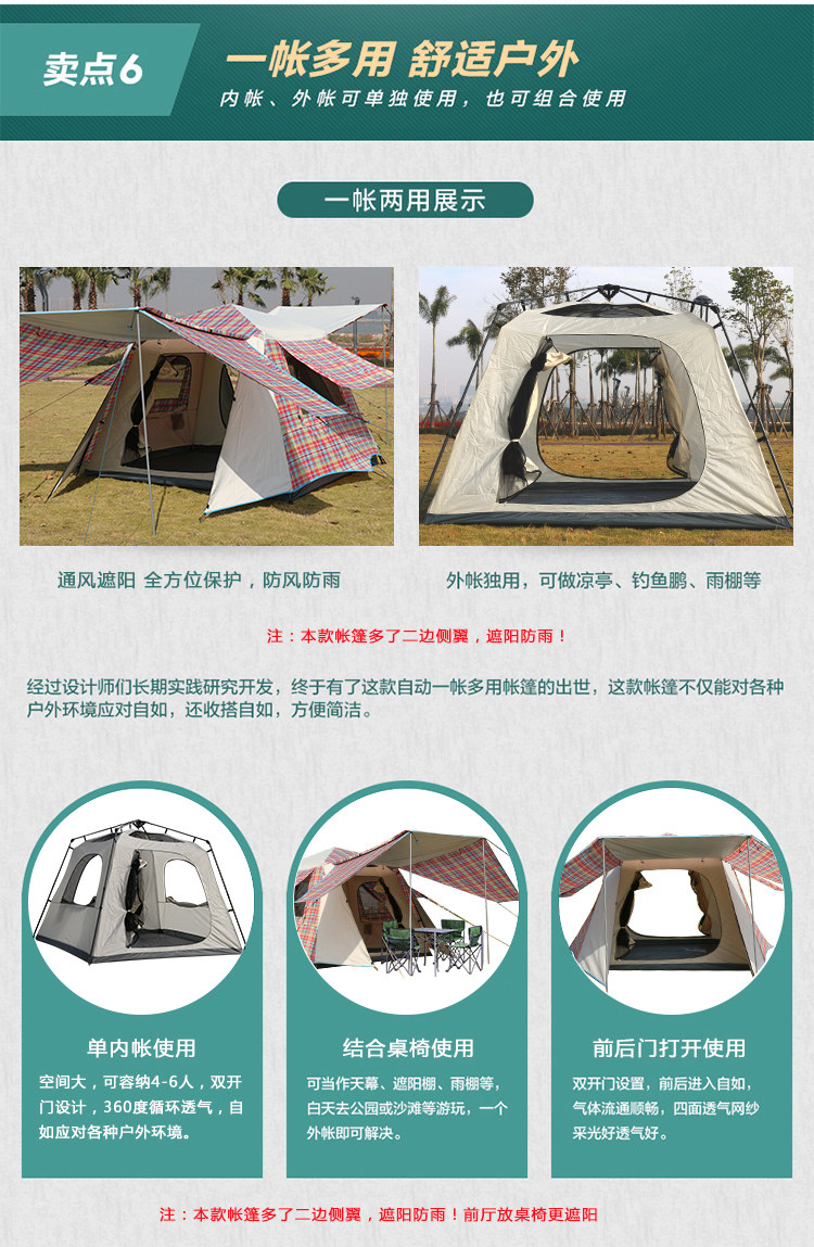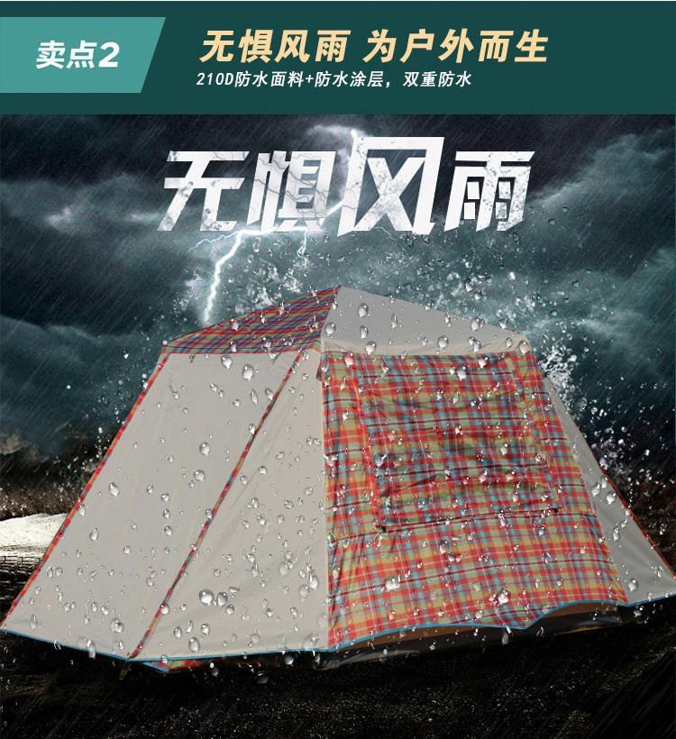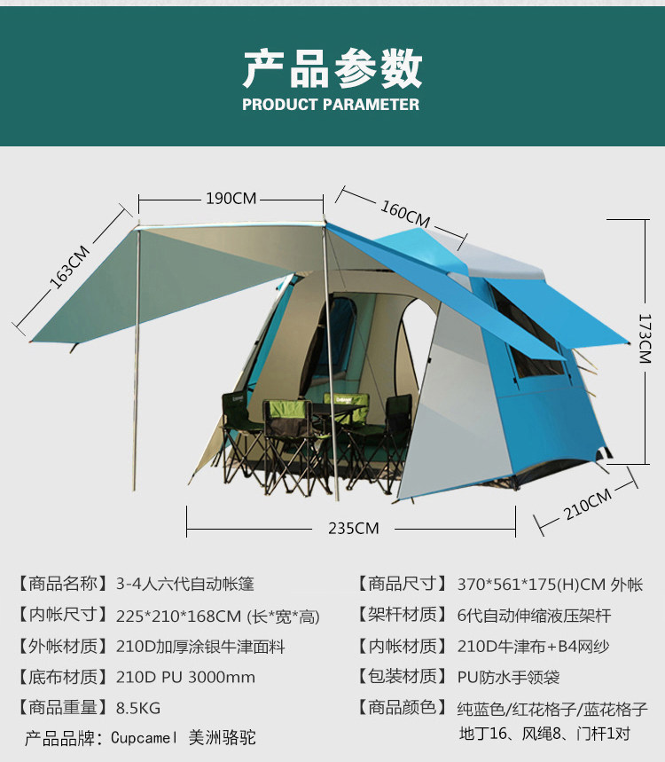 Наименование: Автоматическая палатка для 3-4 человек Внутренний Размер: 225*210*168 см Внешний размер: 370*560*175 см Наружная ткань: 210D Толстая водонепроницаемая ткань с серебряным покрытием 3000 мм Внутренняя ткань палатки: 210D Оксфорд + B4 сетка Дно: 210D pu3000mm Полюс: автоматический телескопический гидравлический стержень Сумка для переноски: 98*18*18 см Вес: около 8.5kgs Примечание: Эта цена включает внешний корпус + Внутренний тент + 1 пару опорных палок + 16 гвоздей + 8 канатов + 1 сумка для переноски. Других нет.