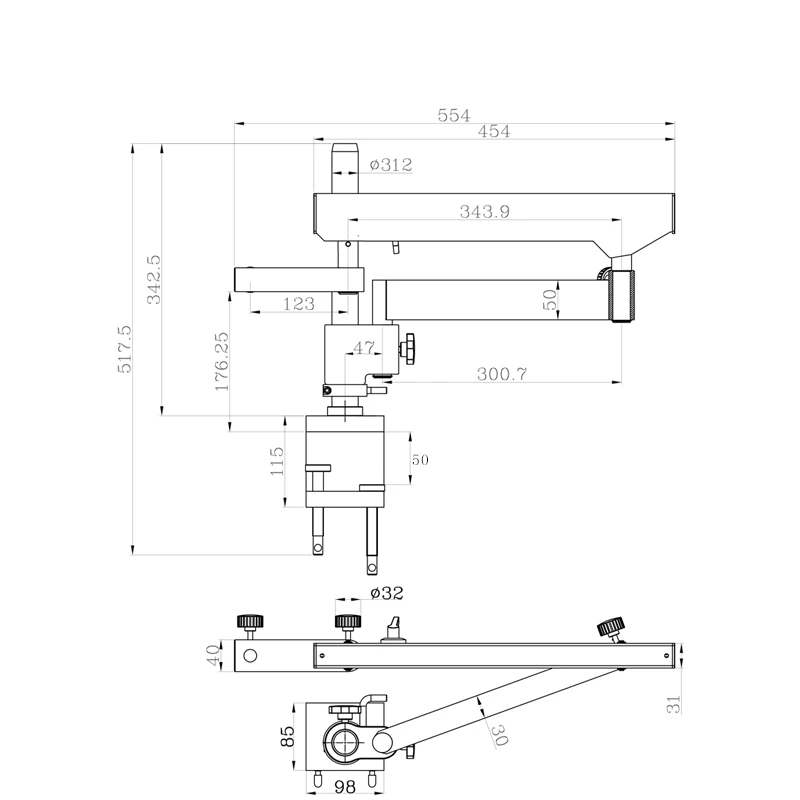 Складной кронштейн | Высота колонны 348 мм, диаметр колонны Φ32мм, вертикальные и горизонтальные стыки, двойное отверстие, перекрещивание рычага, длина поперечной руки 343,9 мм, Горизонтальный диапазон вращения 360 ° |