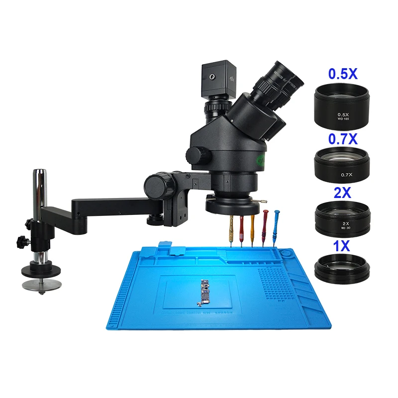 1x черный Тринокулярный Стерео микроскоп с подставкой микроскопа; 1x13 Мп черный HDMI CMOS микроскоп камера с и светодиодный диммер; 1x антистатическое высокотемпературное сопротивление многофункциональный с силиконовой прокладкой; 1 пылезащитный чехол; 1x мощность микроскопа; 1x 0.5x объектив; 1x 2.0x объектив; 1x 0.7x объектив; 1x 1.0x объектив; 1 пара WF10X/20 мм окуляра с резиновыми защитные очки; 1x 56 светодиодный светильник; 1x HDMI кабель.