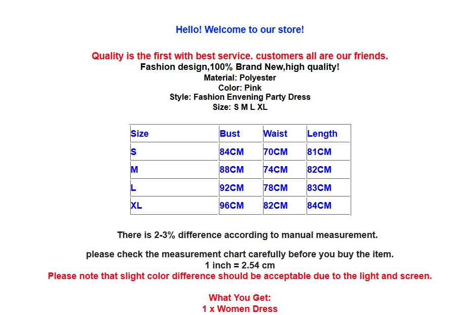 Здравствуйте! Добро пожаловать в наш магазин! Качество является первым с лучшим обслуживанием. Все покупатели — наши друзья.Модный дизайн, 100% новый бренд, высокое качество!Материал: ПолиэстерЦвет: розовыйСтиль: модное праздничное платьеРазмер: S M L XL