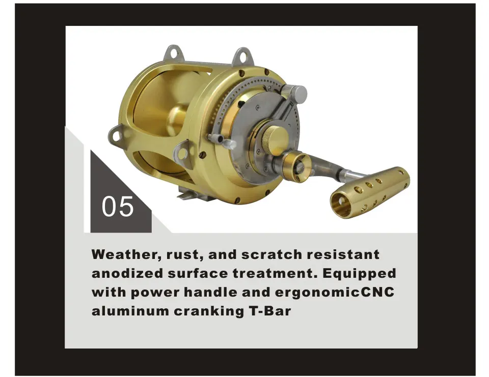 Этот мультипликатор обеспечивает прочность и надежность прочной алюминиевой рамы, что делает его идеальным для рыбалки более тяжелой лески для гигантских рыб. Эти катушки идеально подходят для дальней рыбалки.
