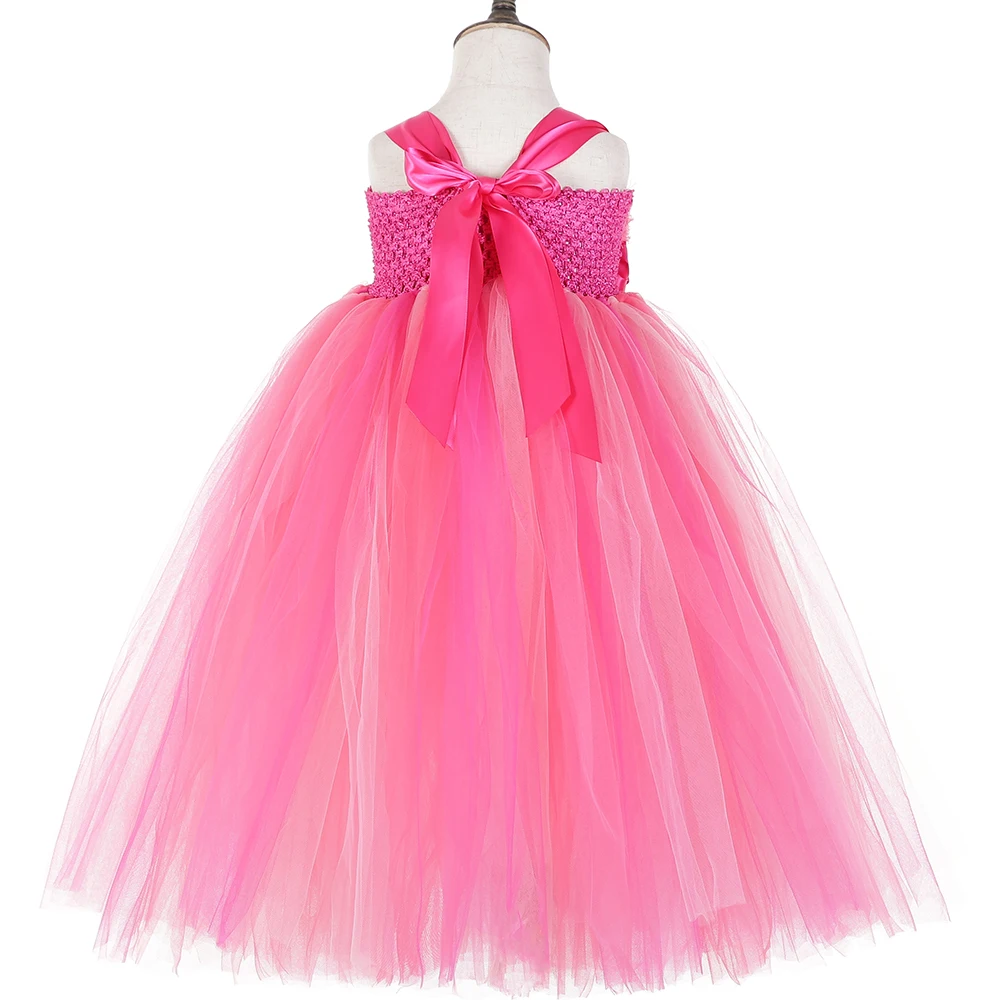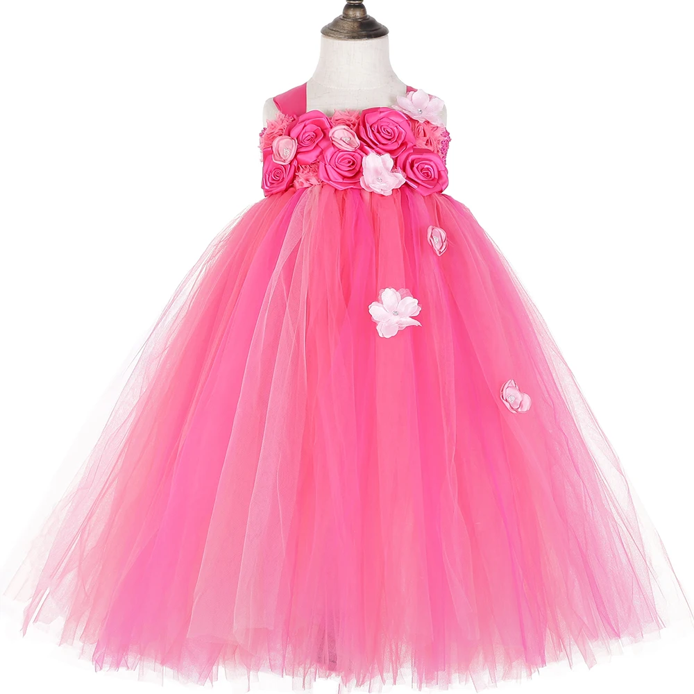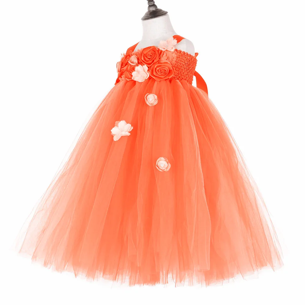 Оранжевое ярко-розовое платье-пачка с цветочным узором для девочек свадебное платье длиной до щиколотки с розами для девочек платье из фатина, детское платье принцессы От 1 до 14 лет