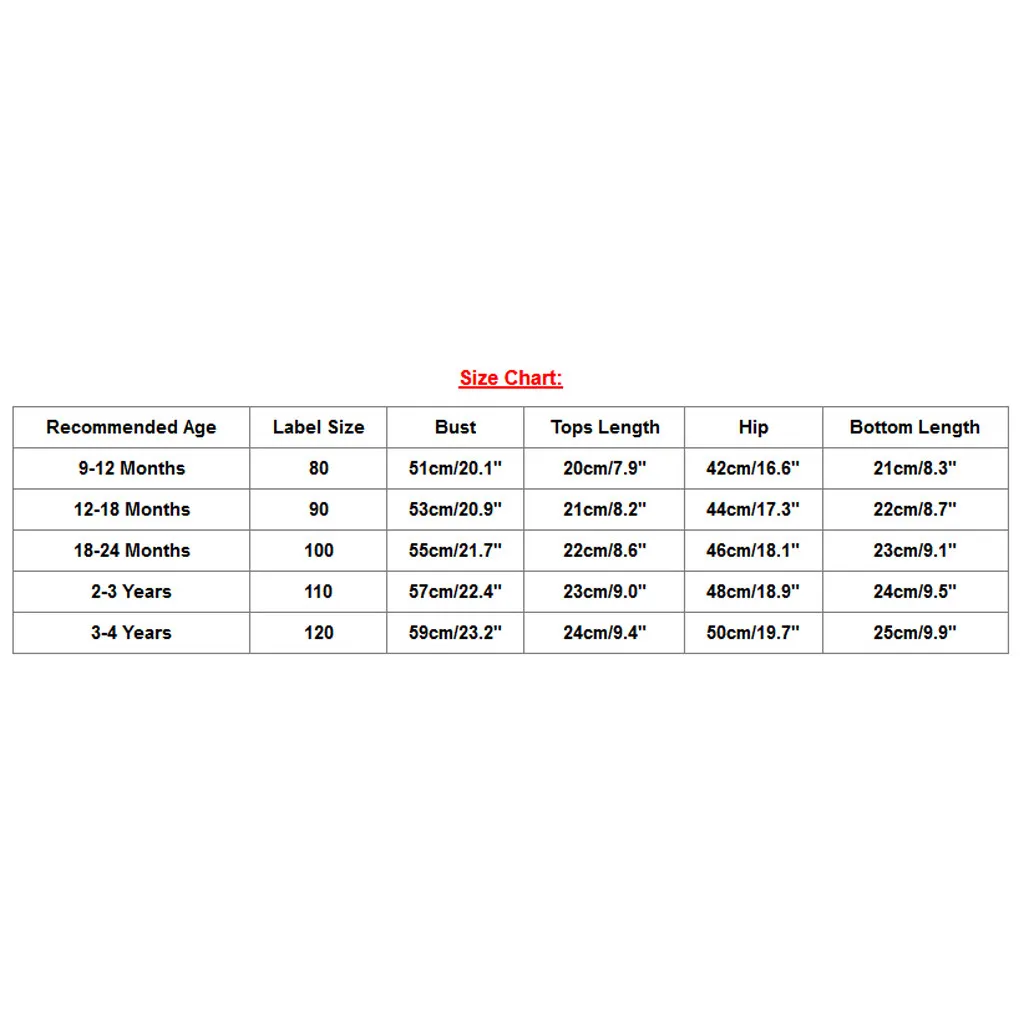 | Рекомендуемый возраст: 18-24 месяцев | Размер этикетки: 100 | Бюст: 55 см/21,7" | Длина топа: 22 см/8,6 дюйма | Обхват бедер: 46 см/18,1 дюйма | Длина низа: 23 см/9,1 дюйма |