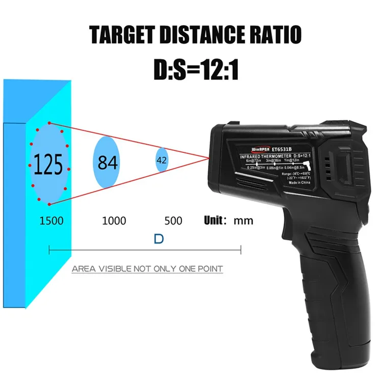 This is a professional non-contact infrared digital thermometer, which has the following functions: 12-point temperature test area indication, 0.5s quick test, temperature difference alert, LCD colorful screen, adjustable reflectivity and so on. It is a practical industrial thermometer.