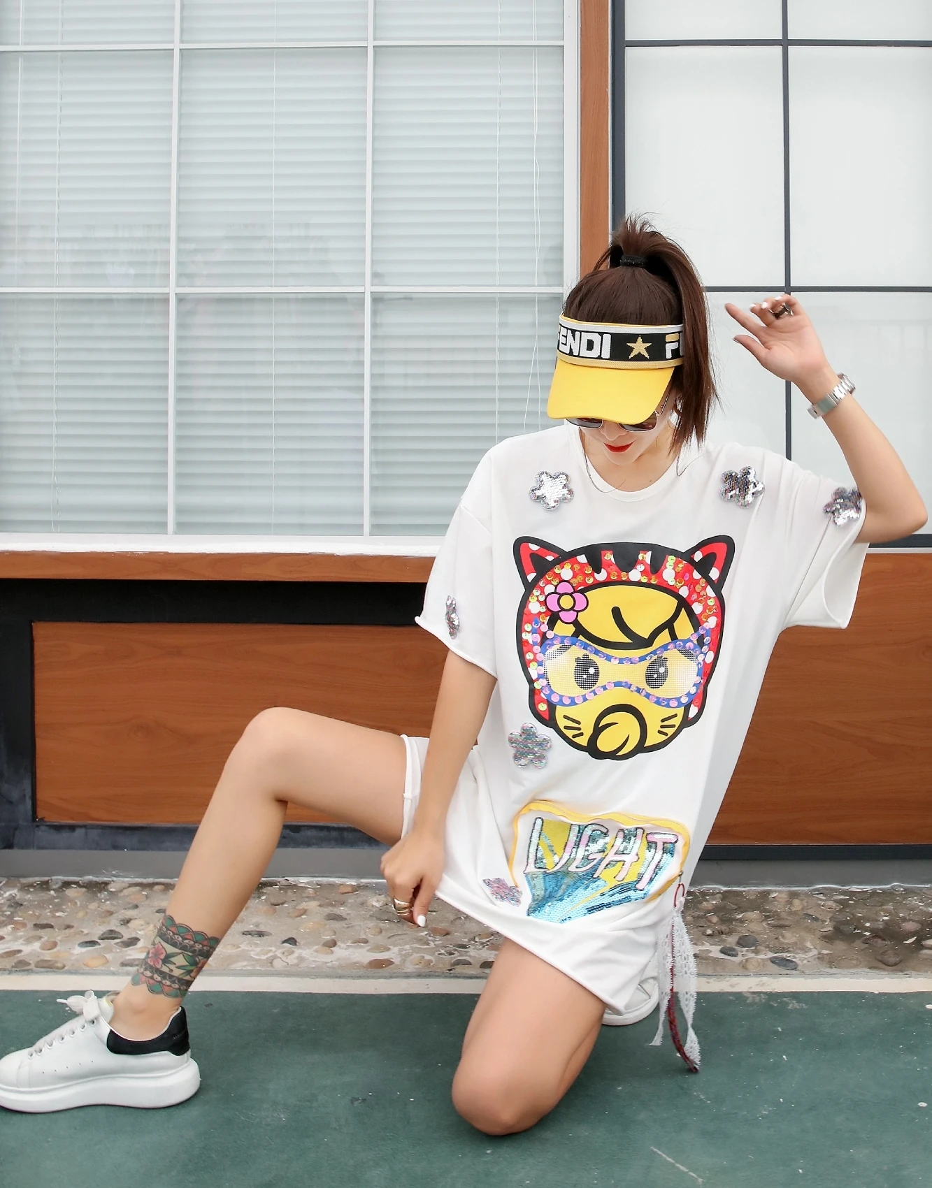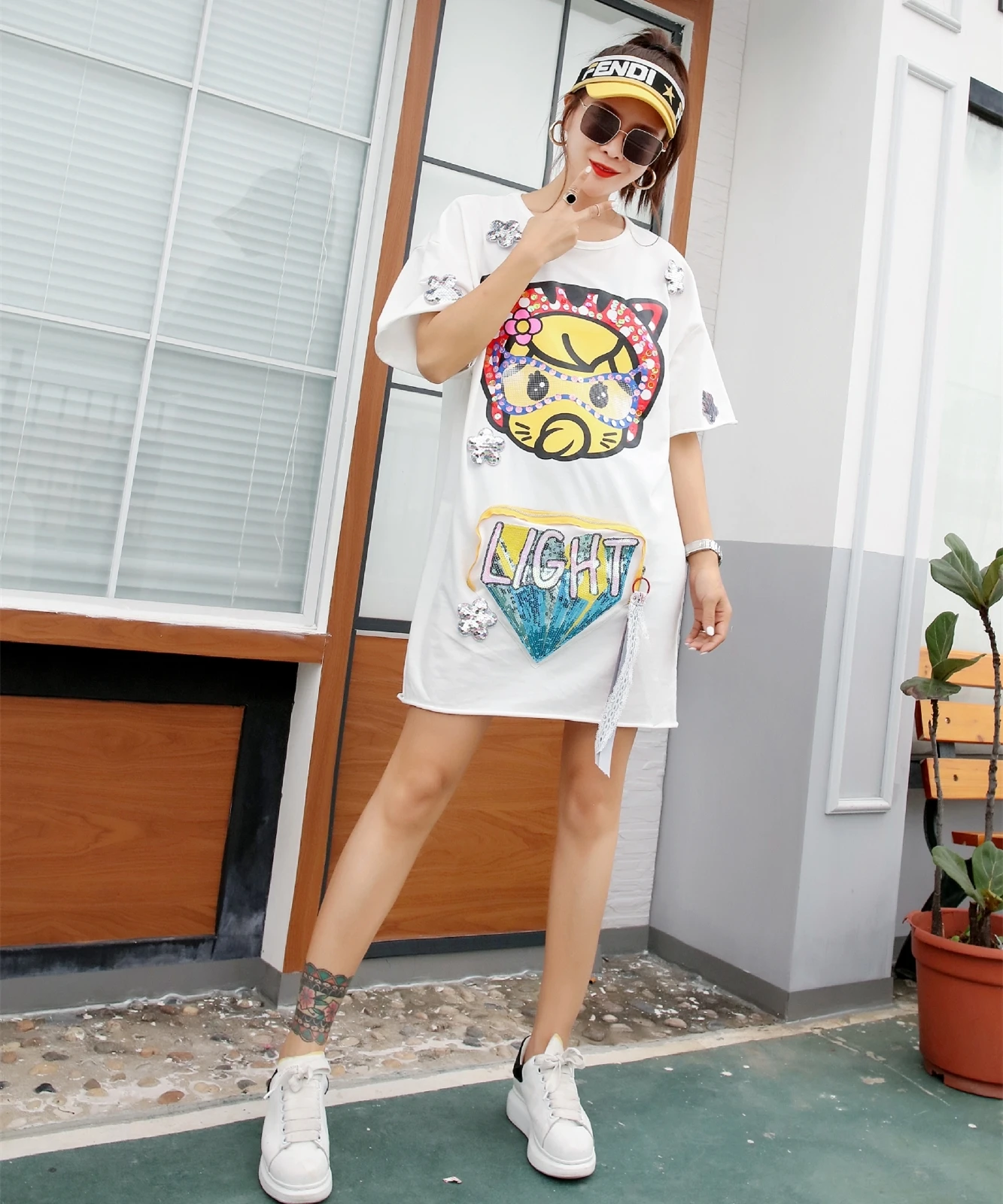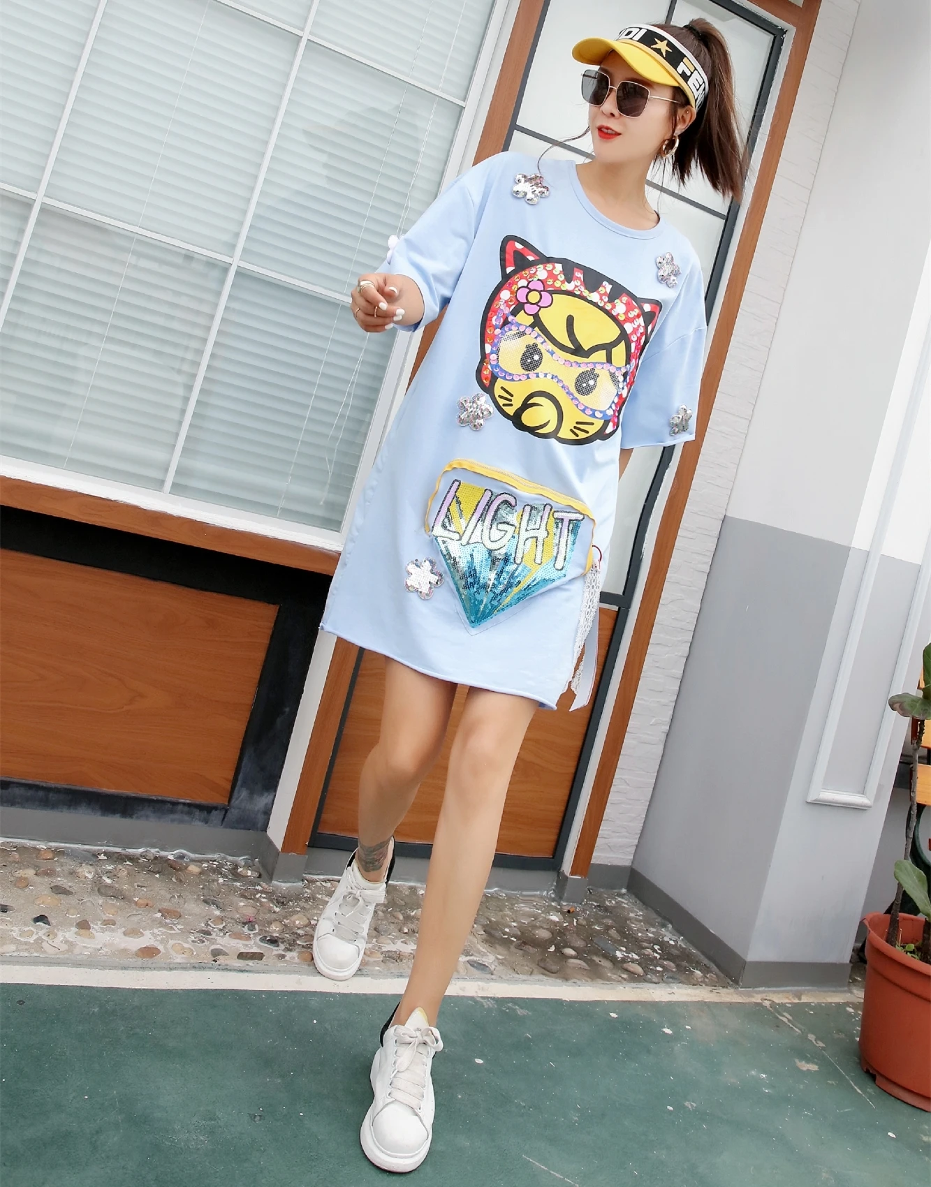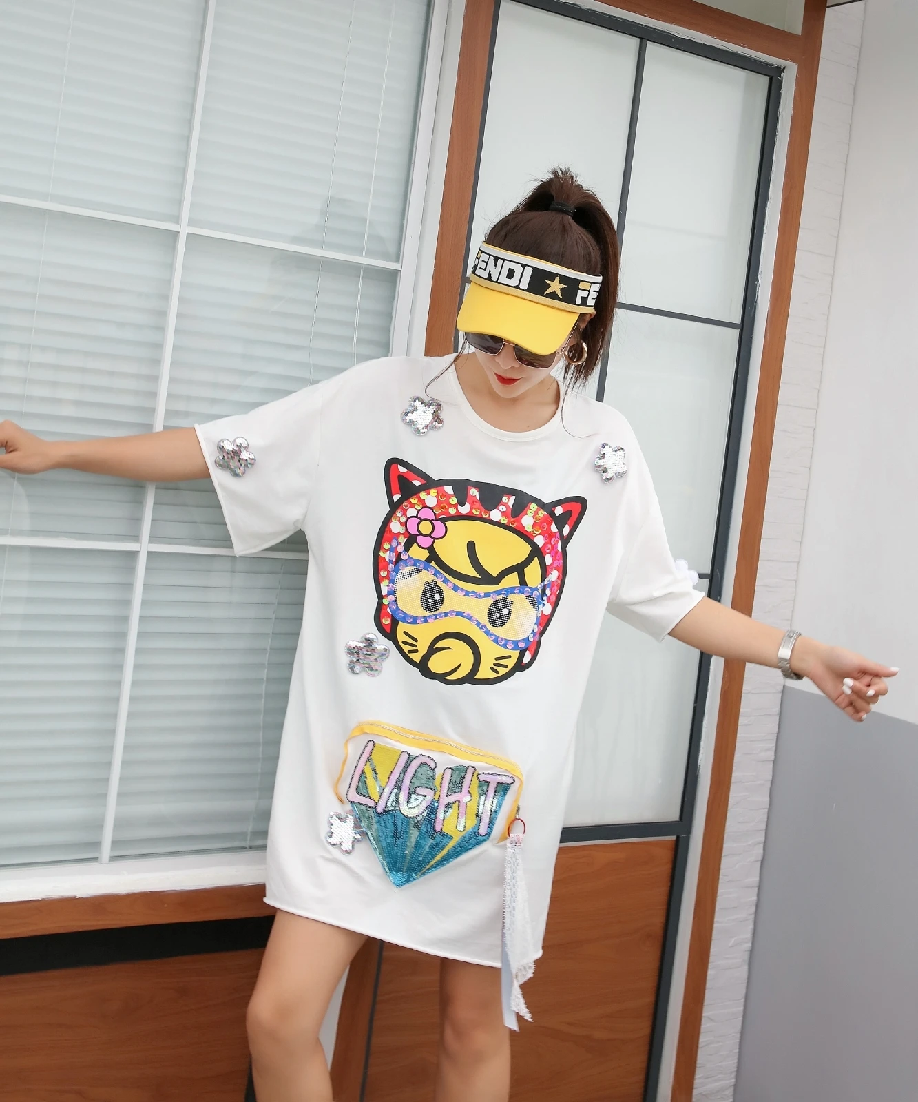 QING MO кисточки короткий рукав платье для женщин мультфильм блесток длинная футболка платье сплайсированные цветы платье с карманом летние топы ZLDM089