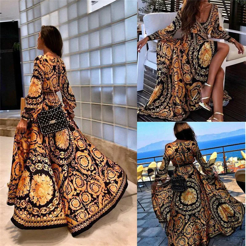Женское богемное платье с цветочным принтом, сексуальное длинное платье макси с v-образным вырезом, свободный пляжный повседневный летний сарафан с длинным рукавом размера плюс, Новинка