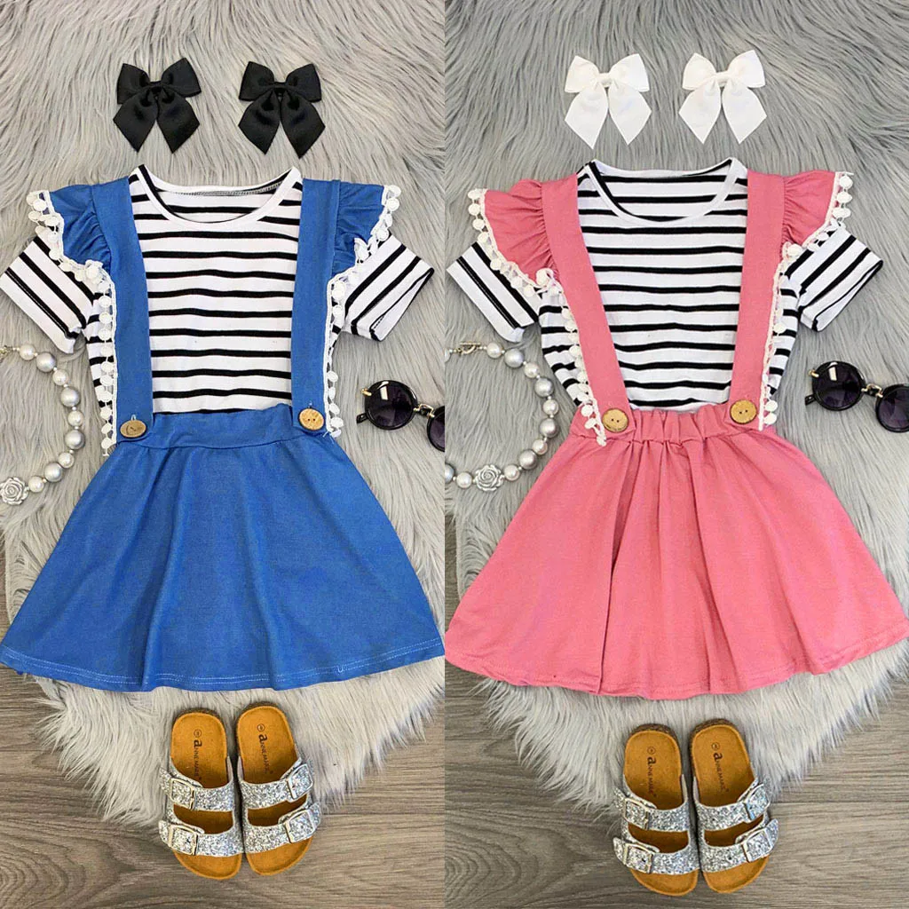 Полосатая футболка с принтом для маленьких девочек, топы + Одноцветный кружевной комбинезон, комплекты с юбкой