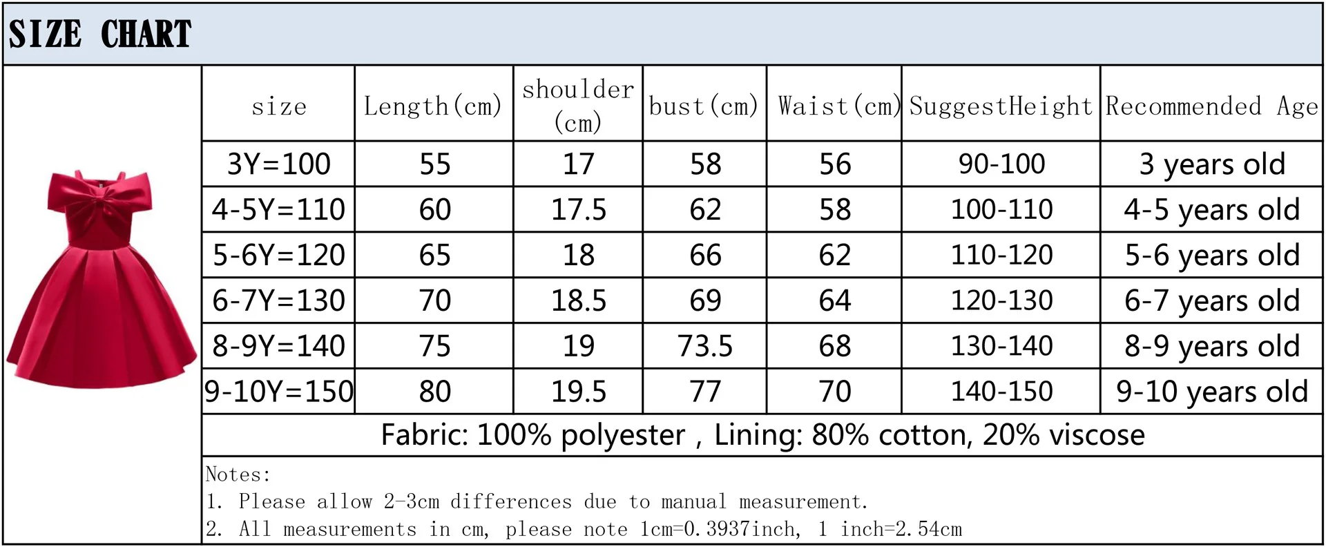 Dress for girls | Size | Length/cm | Bust/cm | Waist/cm | Proposed Age | Measurement |