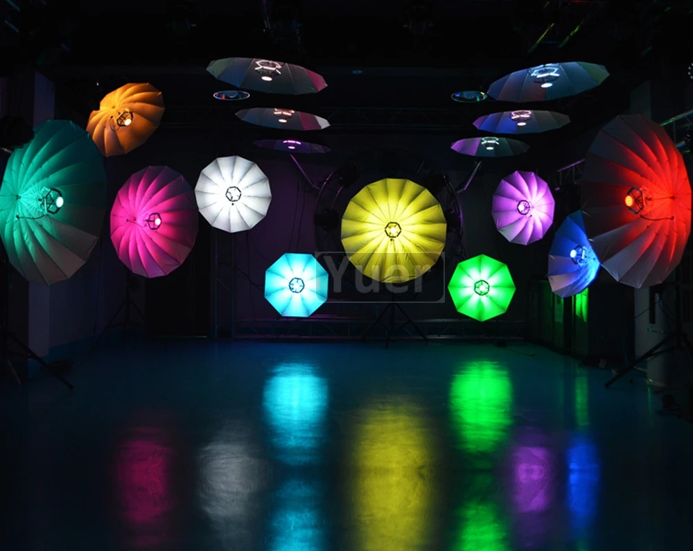 Voltage: 100-240V AC 50/60HZ power consumption: 20W Light Source: 114 pcs 0.2W RGB LED Umbrella: 20inch 97cm diameter light up area DMX Channels: 6/24 DMX channels in optional LED display and 4 menu buttons DMX Wireless transceiver interface with USB DMX, Automatic mode,PWM1200 and flicking free Rainbow & color chasing & fade color changing 1-10 time/s pulse and random strobe effect Pixel controlled section with marco effect 0-100% electronic linear dimming Pure Red/Green/Blue/Ryan blue/Cyan/Amber/cold white/Warm white and other mixing color N.W.: 2kg G.W.: 3.5kg Measurement: 80x29.5x23.5cm