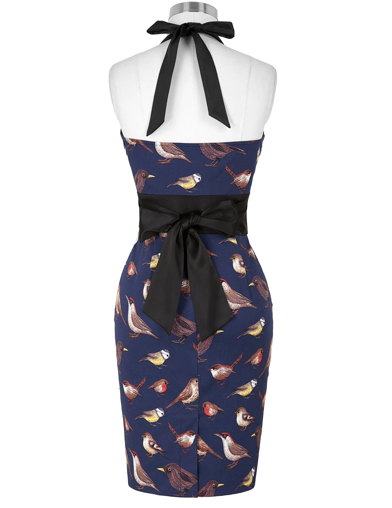 Платье Особенности | 1) Модель с лямкой на шее 2) 3 кнопки украшения спереди 3) раздельный дизайн в середине задней части 4) скрытая молния слева 5) фиксированная черная поясная лента 6) яркий рисунок птиц |