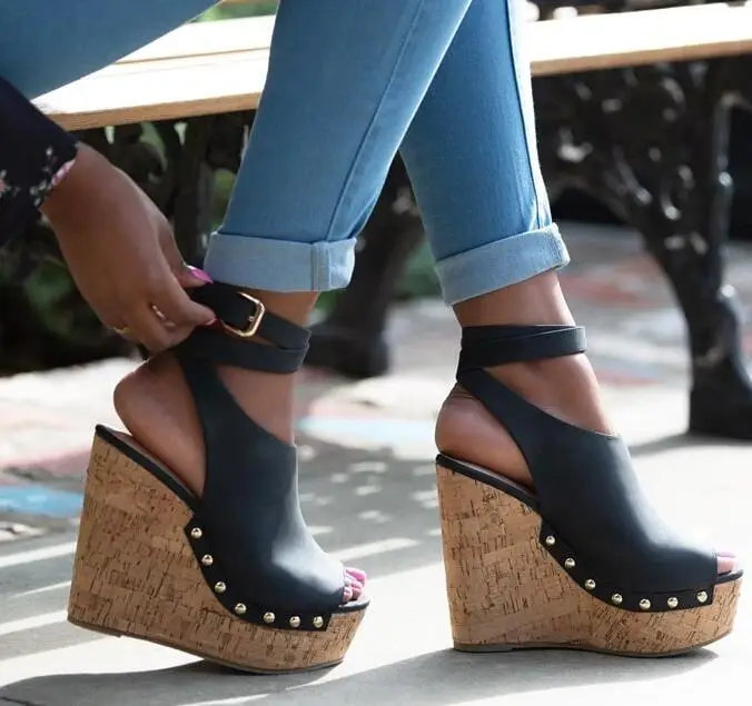 Лидер продаж; Женские модельные туфли; Сандалии на танкетке с открытым носком и ремешком на лодыжке